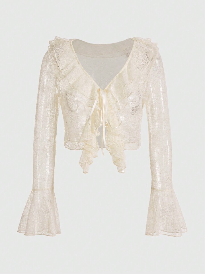 Fairycore Lace Perspective Ruffle Hem Tie Front Top