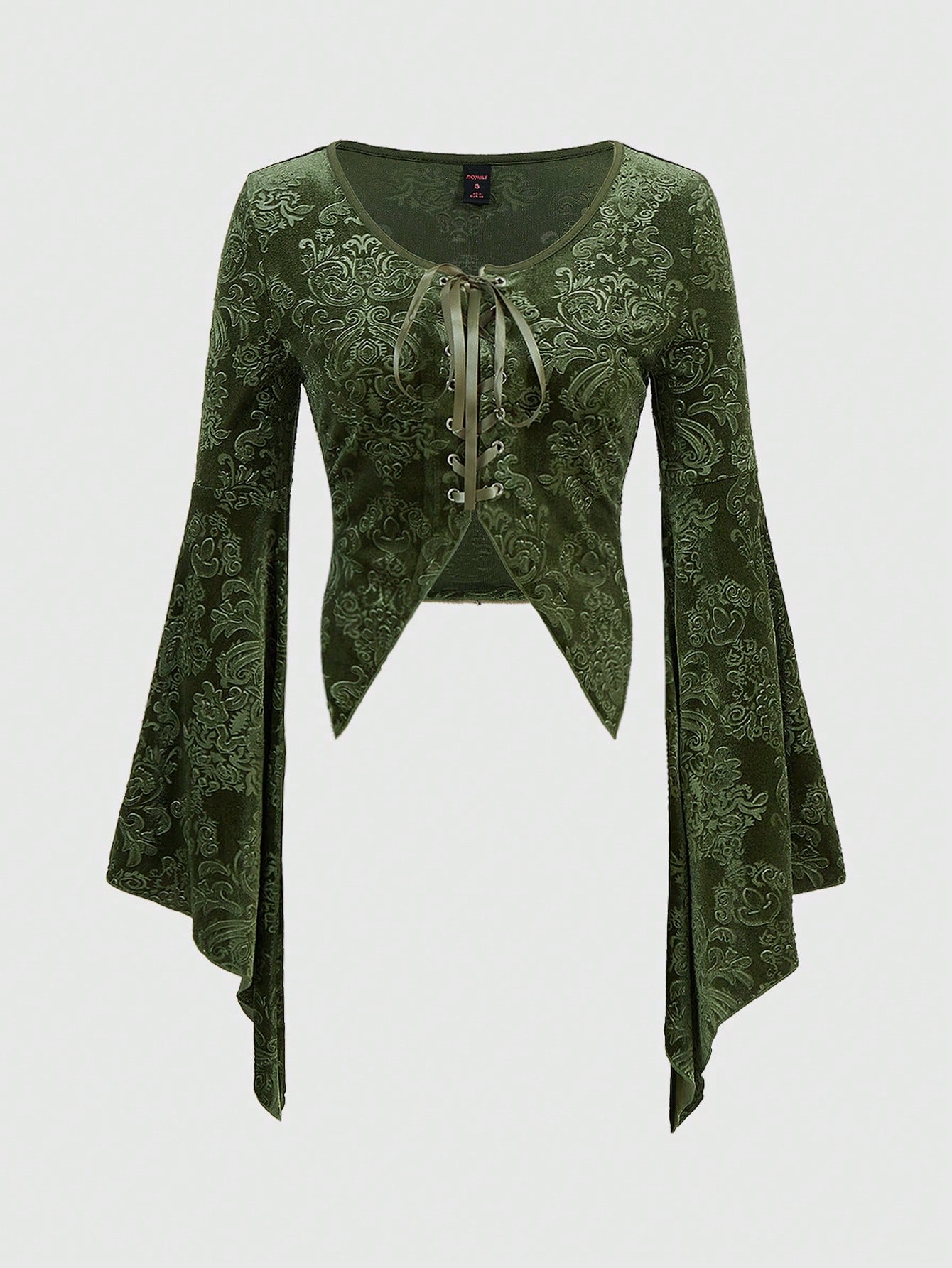 Fairycore Lace Up Front Trumpet Sleeve Asymmetrical Hem Jacquard Top