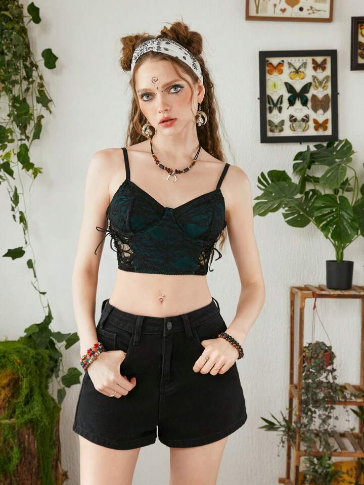 Fairycore Lace Up Side Contrast Lace Cami Bra