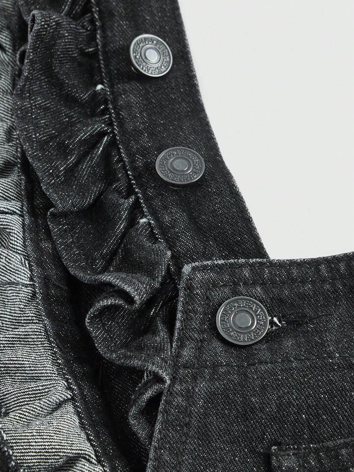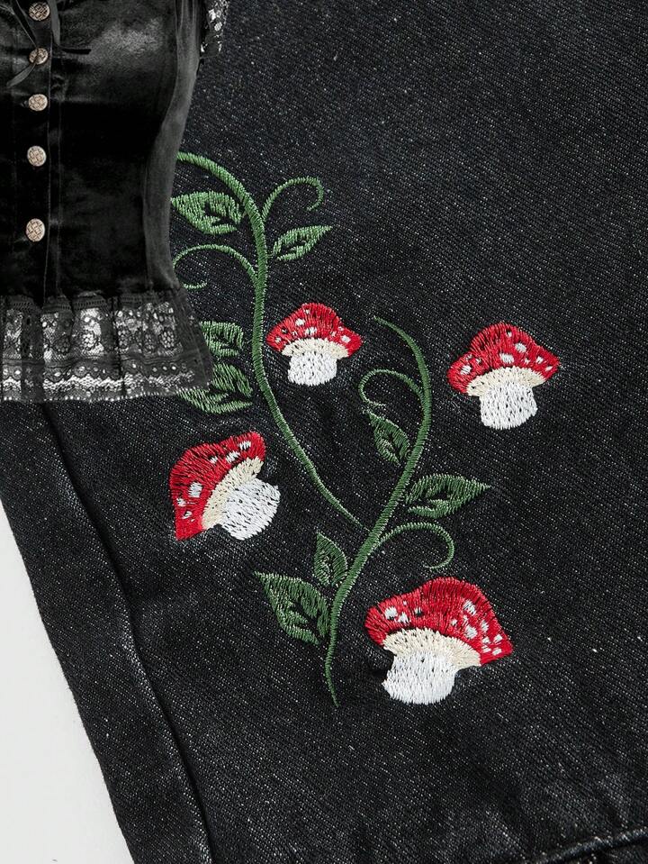 Fairycore Mushroom Embroidery Ruffle Trim Denim Overall Romper