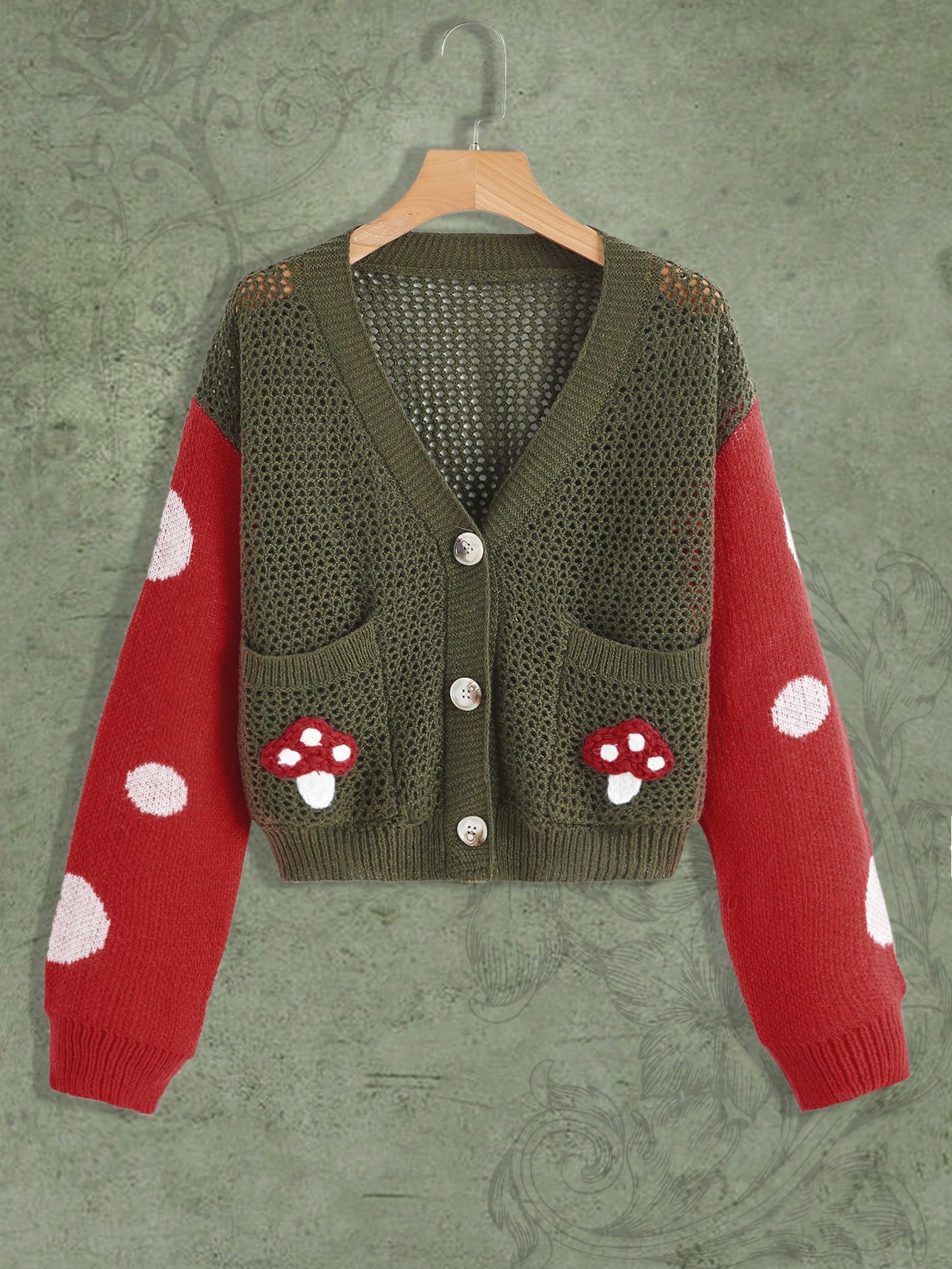 Fairycore Mushroom Pattern Colorblock Drop Shoulder Cardigan