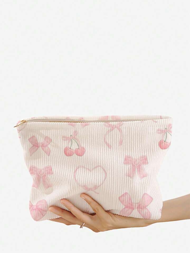Fairycore Pink Bowknot & Cherry Printed Double-Sided Corduroy Cosmetic Bag