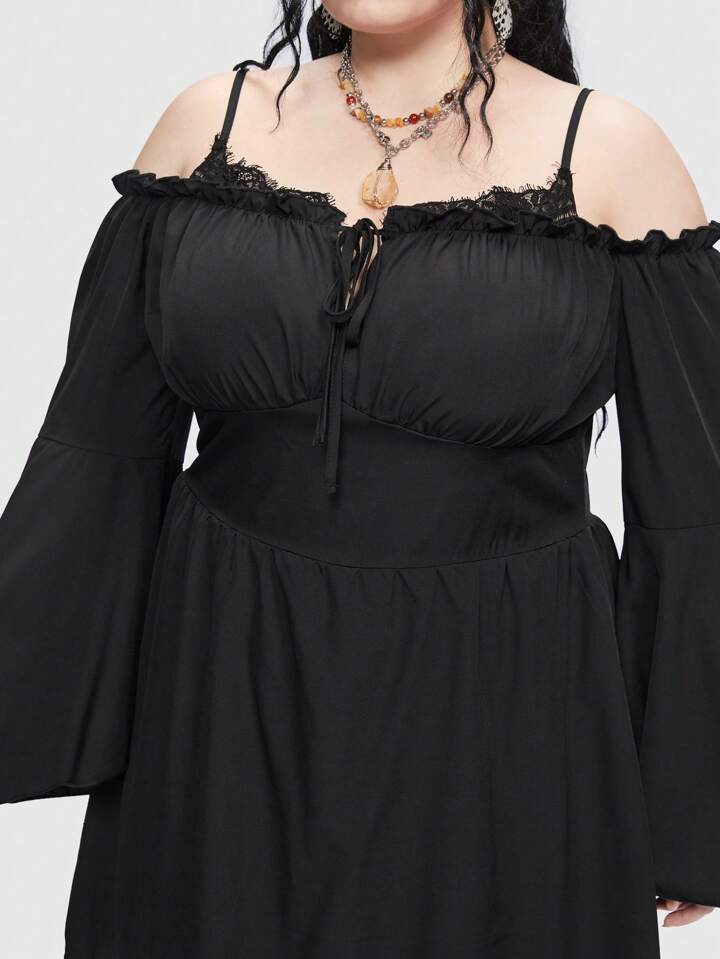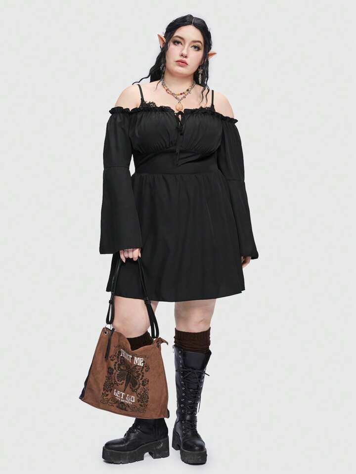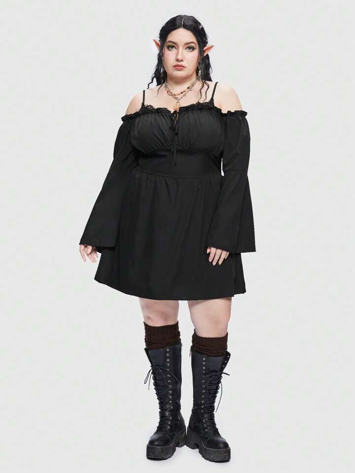Fairycore Plus Cold Shoulder Frill Trim Flare Sleeve Dress