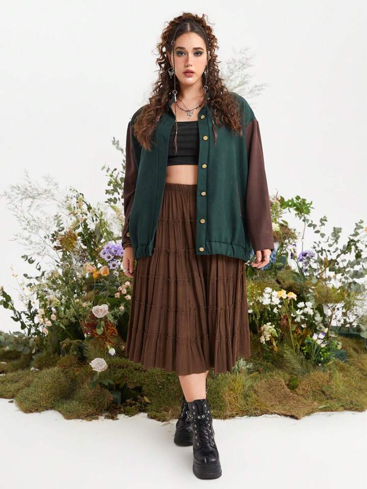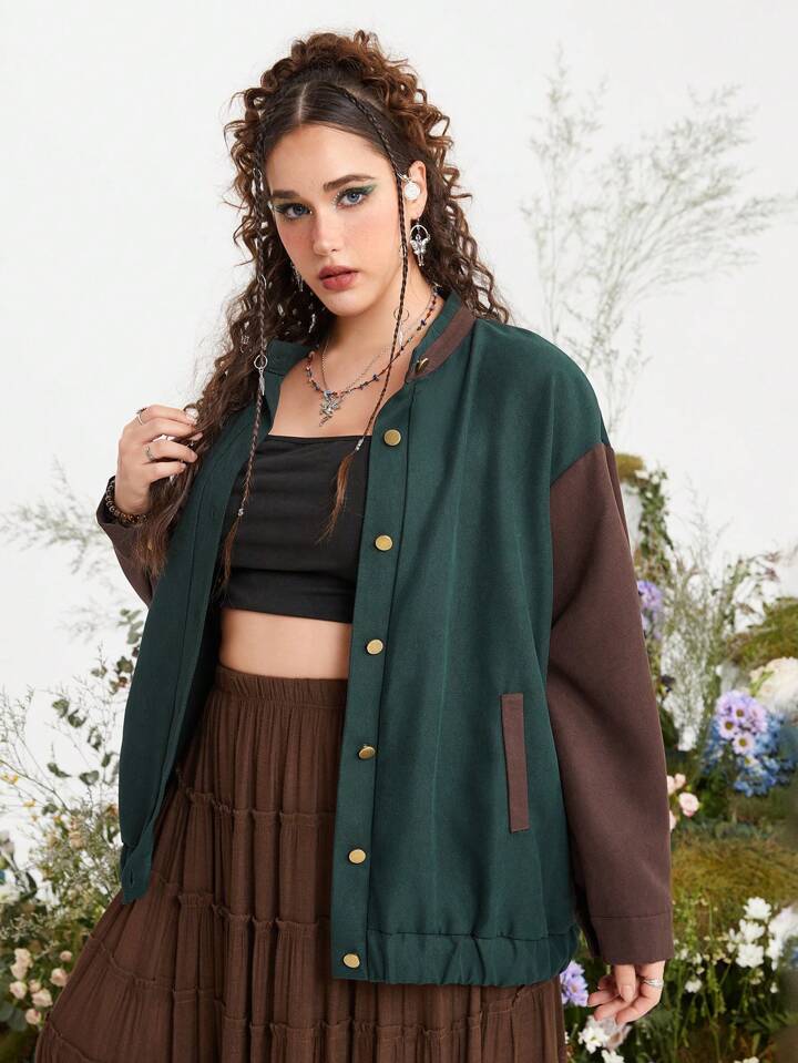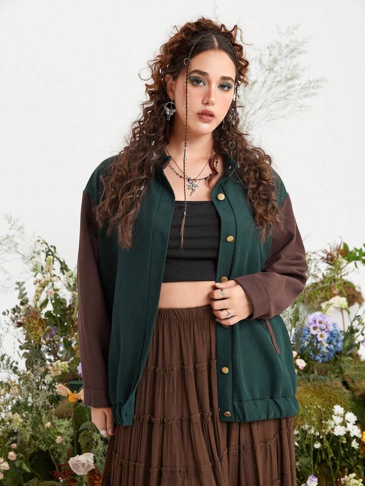 Fairycore Plus Colorblock Drop Shoulder Button Front Jacket