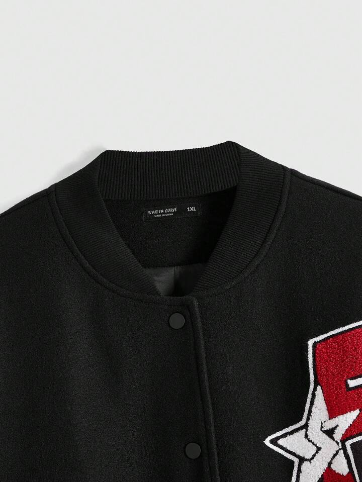 Fairycore Plus Size Dropped Shoulder Contrast Color Embroidered Number Baseball Jacket, Cotton Outerwear