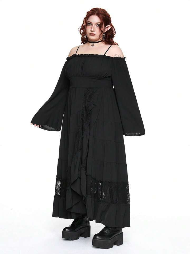 Fairycore Plus Size Fashion Cold Shoulder Strap Flared Sleeve Lace Trim Swing Dress, For New Year