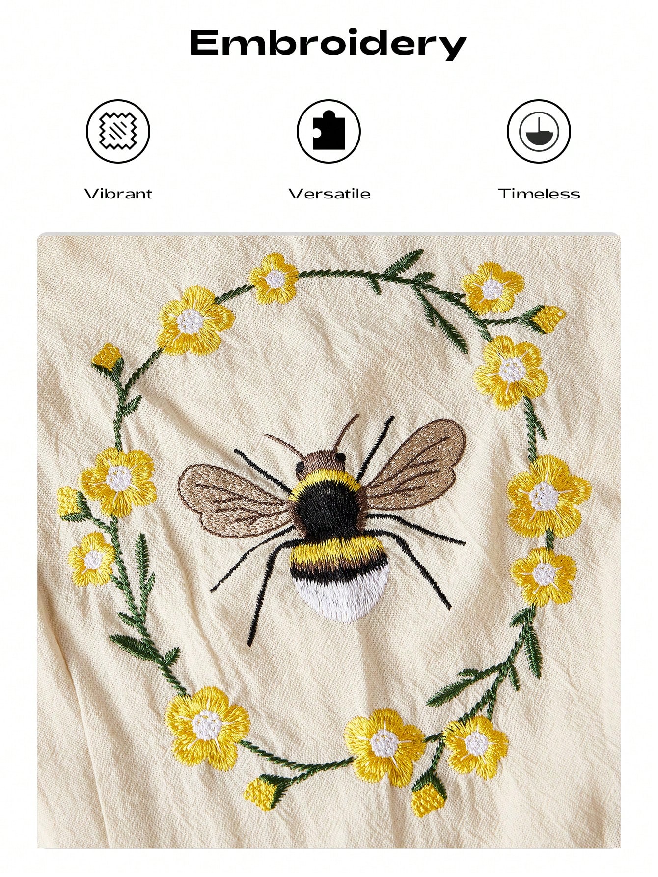 Fairycore Plus Size Honey Bee & Plant Embroidery Cottagecore Beige Dress