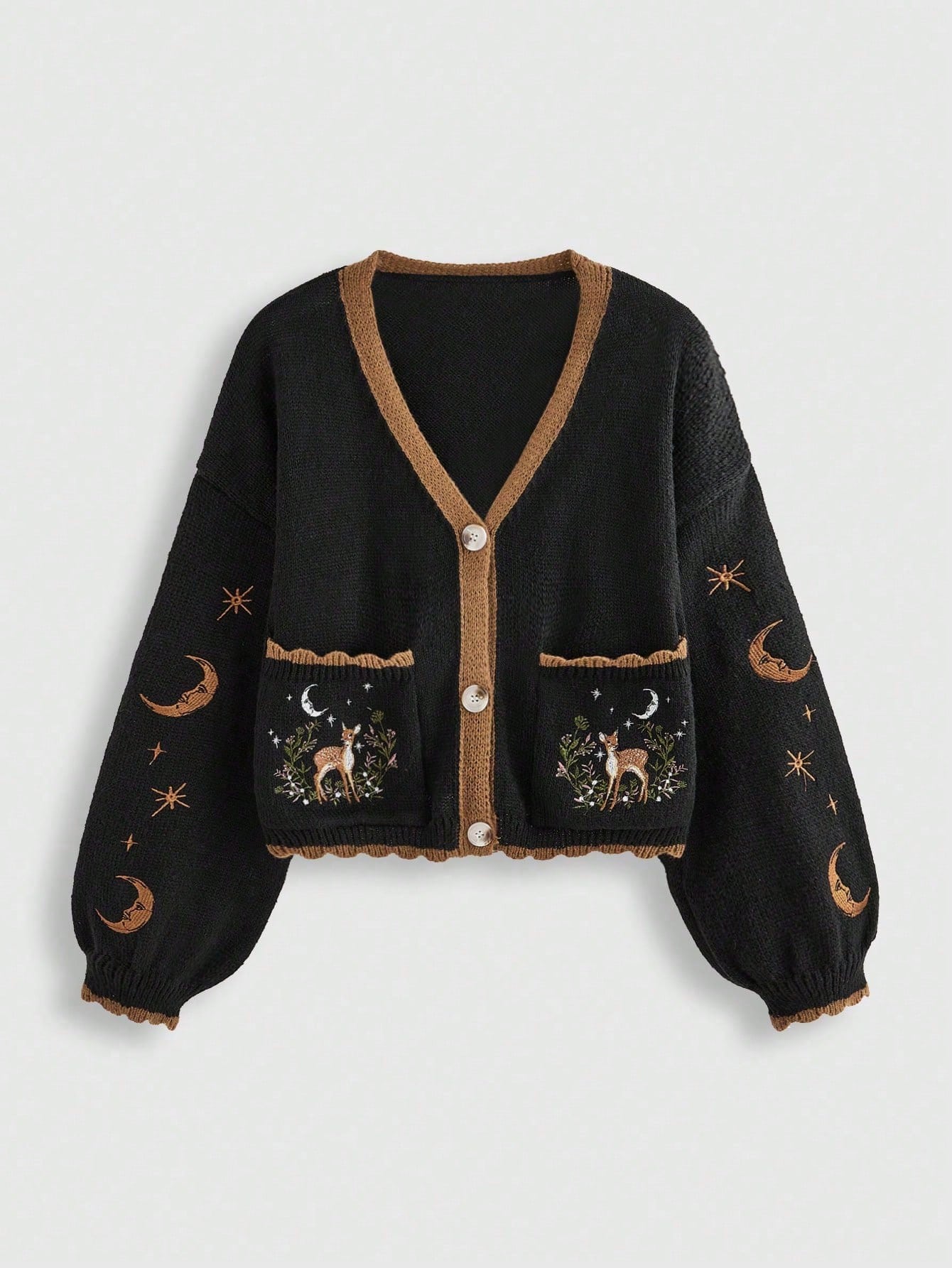 Fairycore Plus Size Solid Color Patchwork Front Button Embroidered Deer Graphic Minimalist Jacket, For Winter