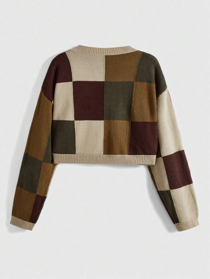 Fairycore Plus Size Women's Butterfly Embroidery Contrast Color Checkerboard Sweater