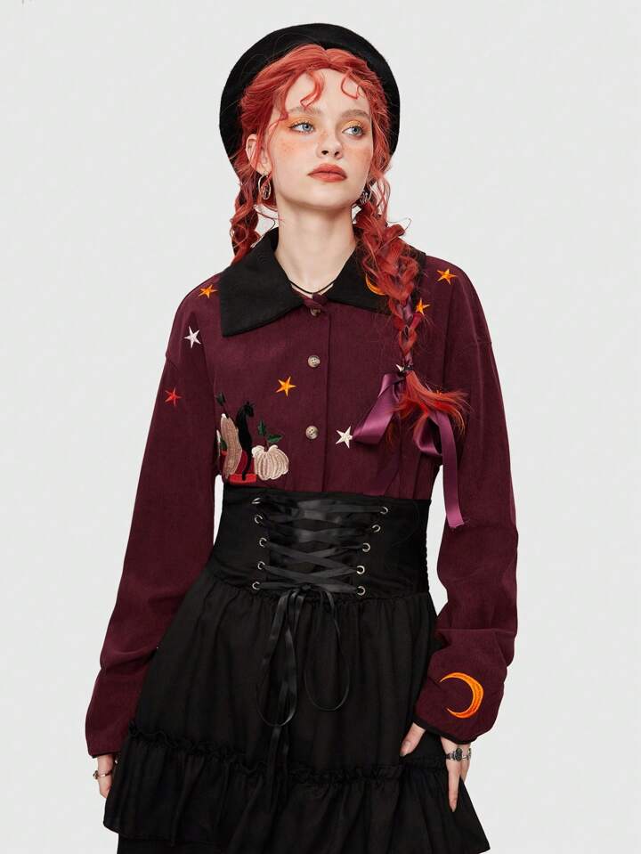Fairycore Pumpkin Embroidery Button Front Corduroy Jacket