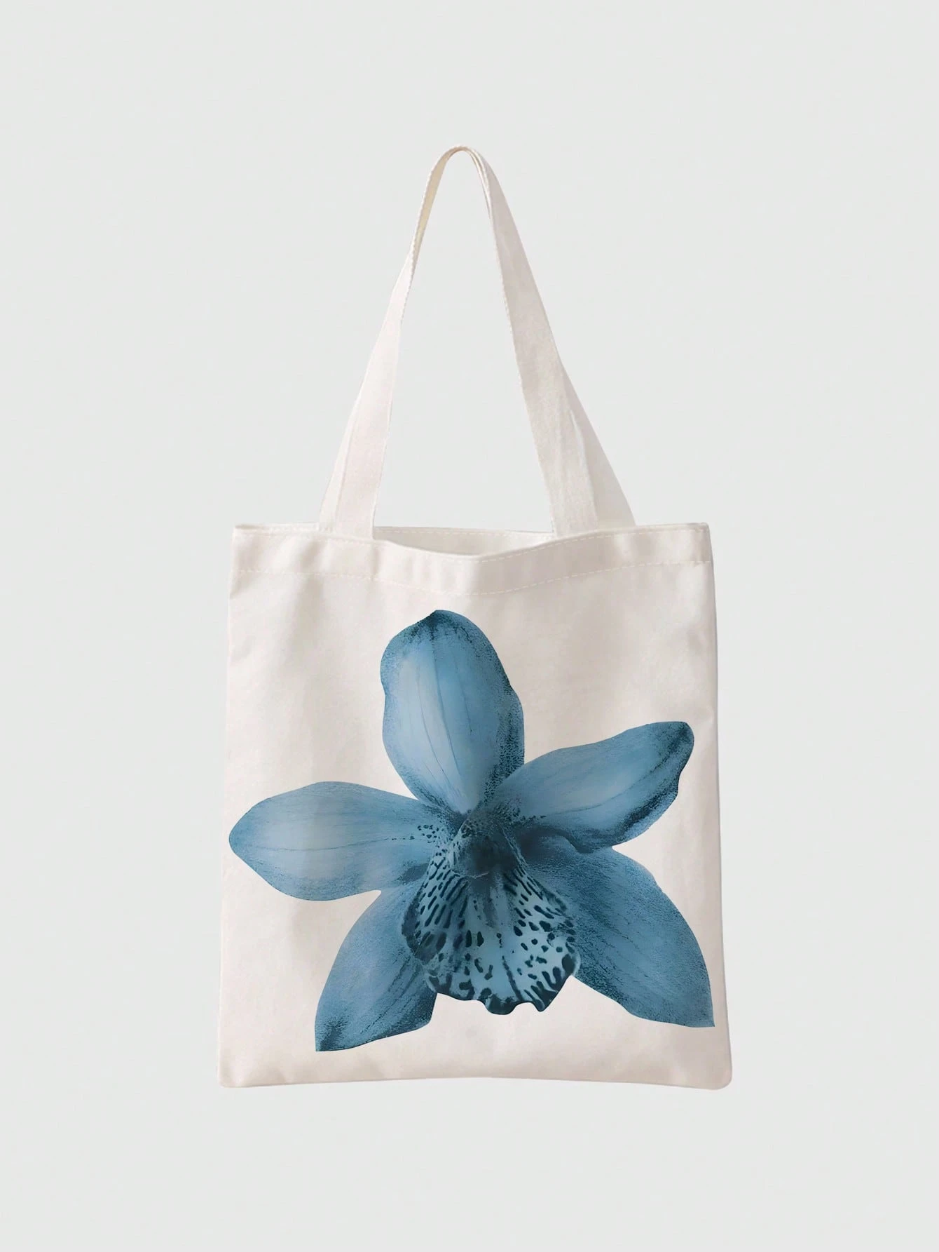 Fairycore Reusable Printed Canvas Tote Bag With Blue Lily Flower Pattern, Vacation Style Shoulder Bag, Suitable For Shopping
