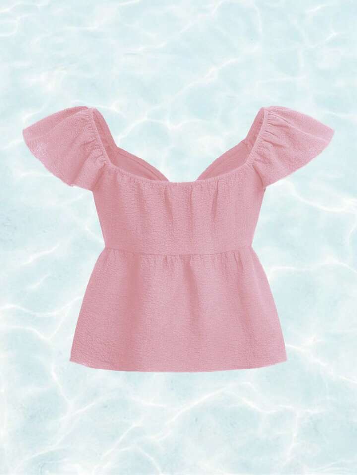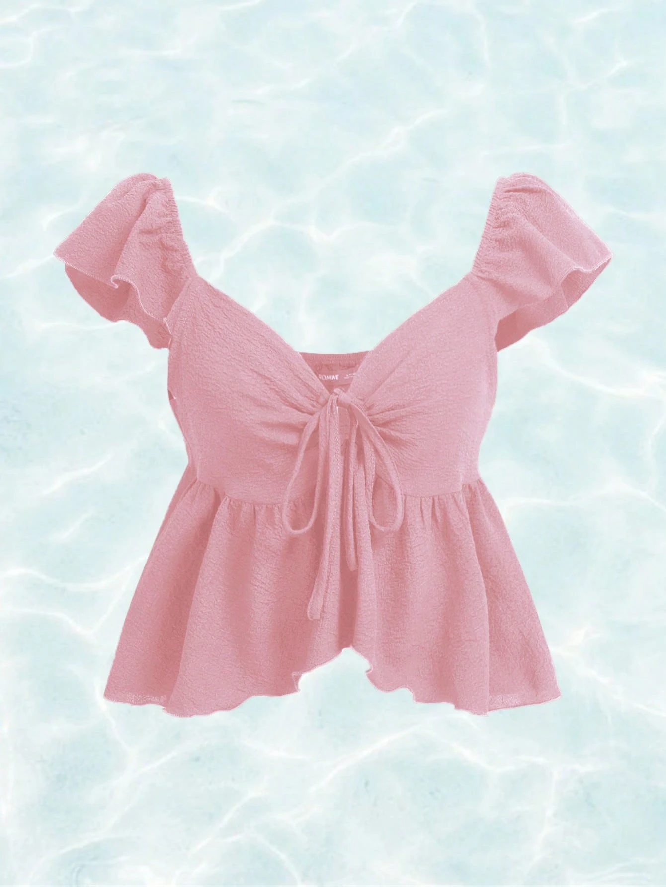 Fairycore Solid Knot Front Ruffle Hem Blouse