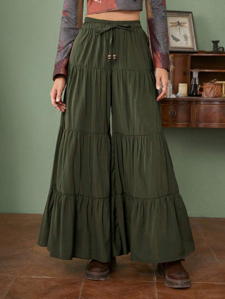 Fairycore Solid Ruffle Hem Wide Leg Pants