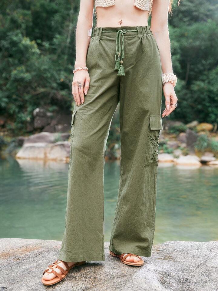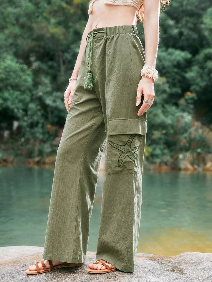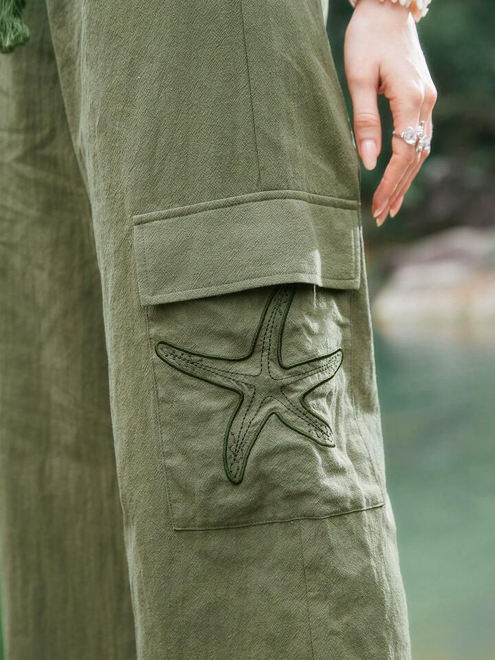 Fairycore Starfish Embroidery Drawstring Waist Flap Pocket Wide Leg Pants