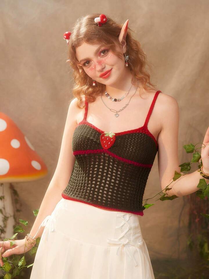 Fairycore Strawberry Embroidery Contrast Binding Hollow Out Knit Top