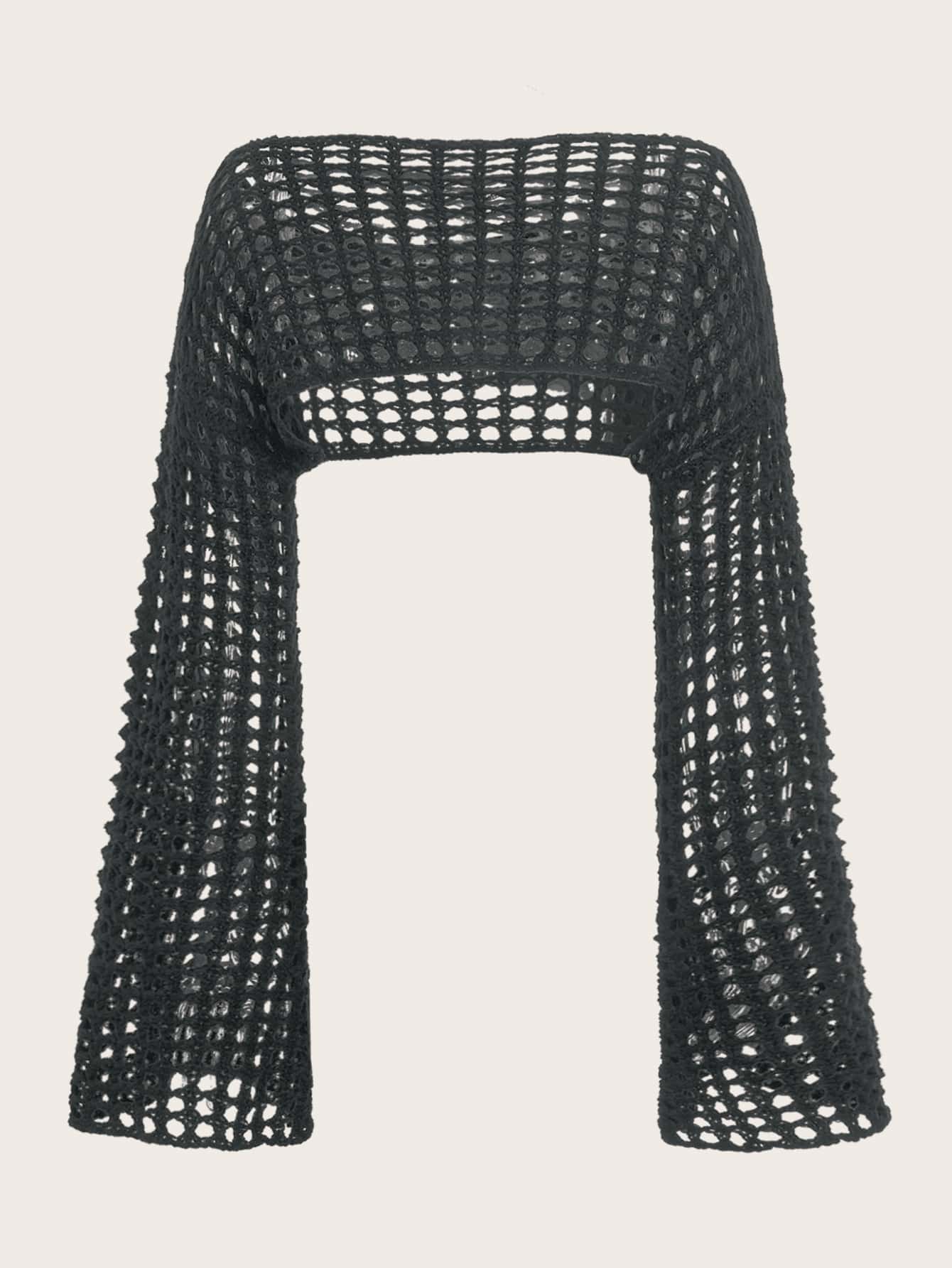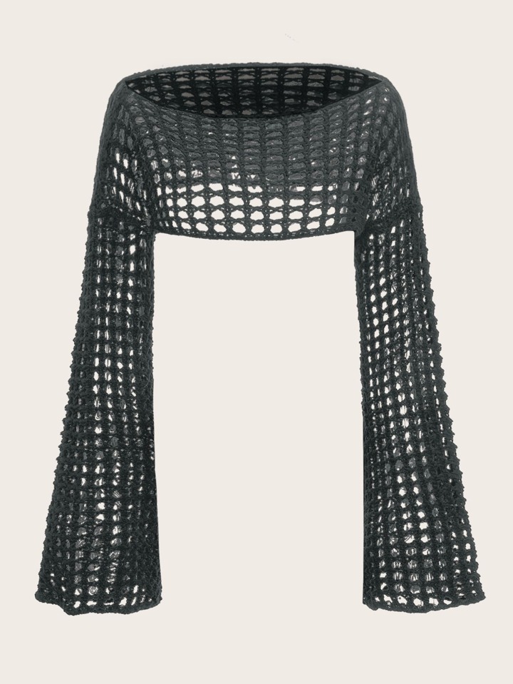 Fairycore Summer Crochet Hollow Out Off Shoulder Trumpet Sleeve Crop Sweater