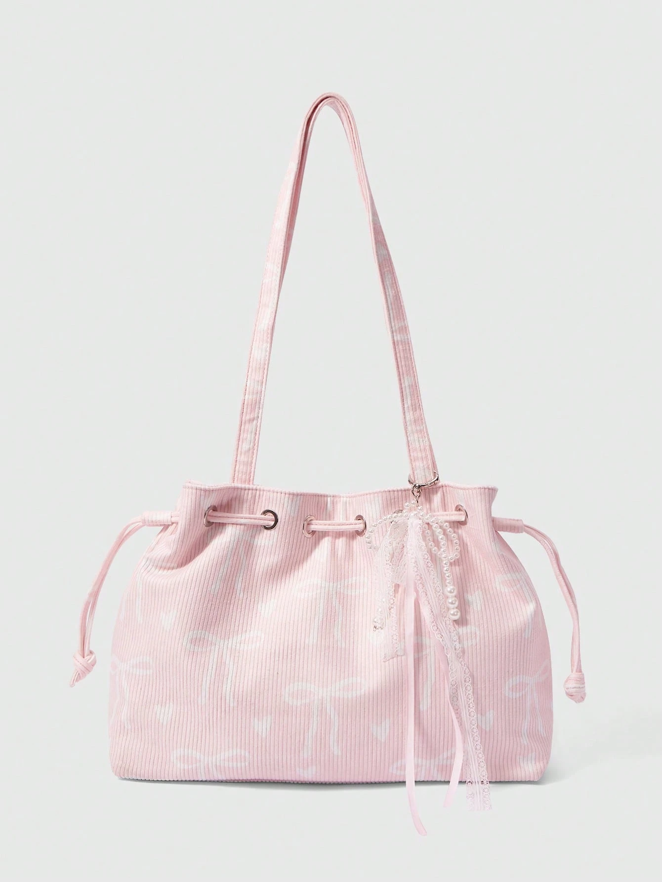 Fairycore Sweet Lace Pearl Bow Tote Bag, Pink Striped Soft Girl Shoulder Bag, College Student Class Commute Bag