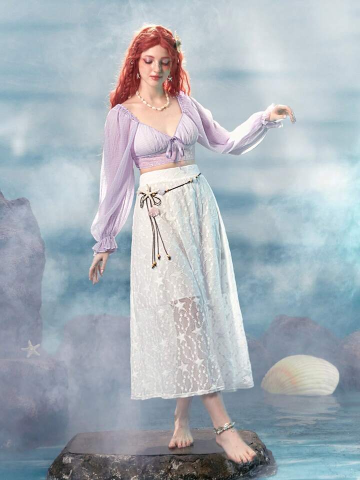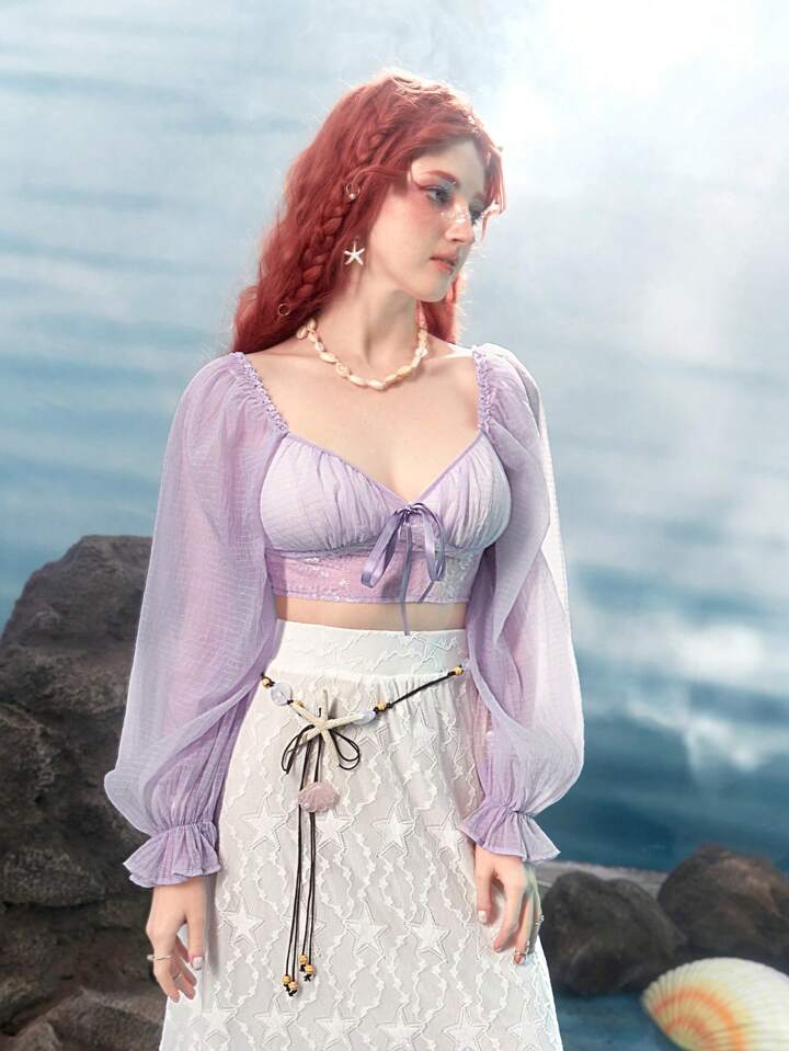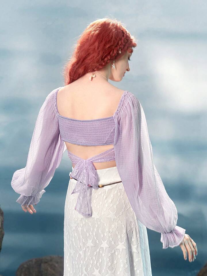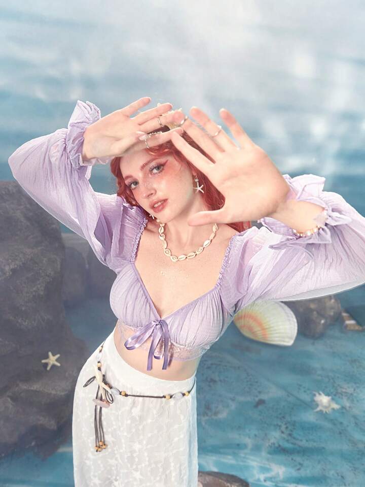 Fairycore Sweetheart Neck Knot Front Flounce Sleeve Crop Blouse