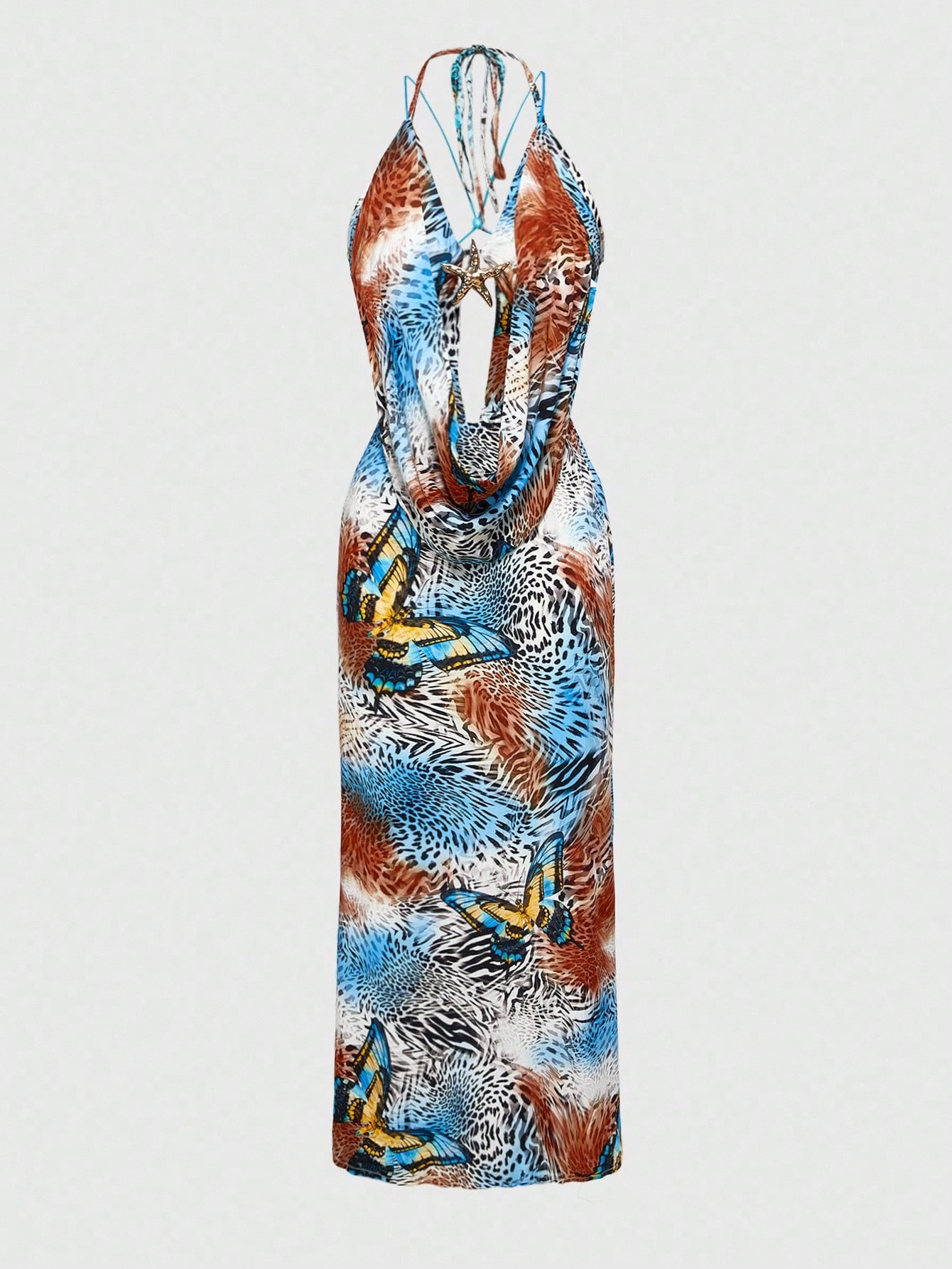 Fairycore Vacation Style Vintage Butterfly & Zebra Print Hollow Out Backless Bowknot Bodycon Mermaid Dress
