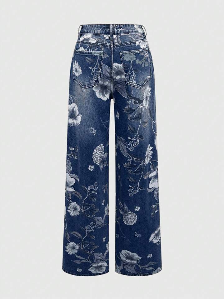 Fairycore Vintage Floral Print Washed Loose Wide Leg Women Jeans, Summer
