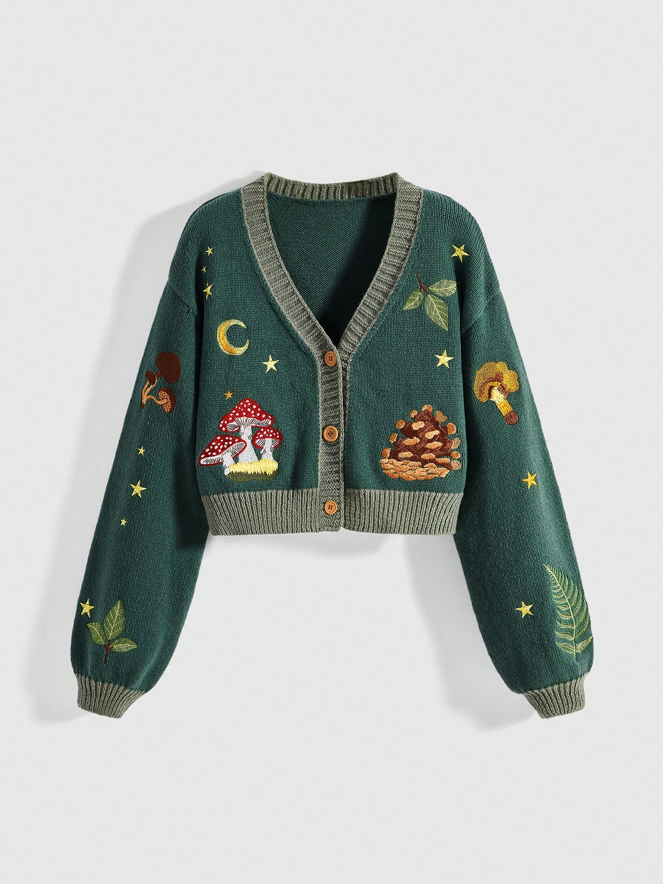 Fairycore Vintage Women V-Neck Button Up Long Sleeve Mushroom, Plant, Moon & Star Embroidered Cardigan Sweater