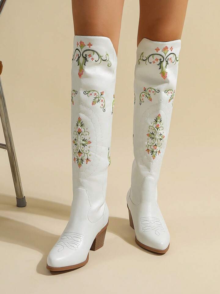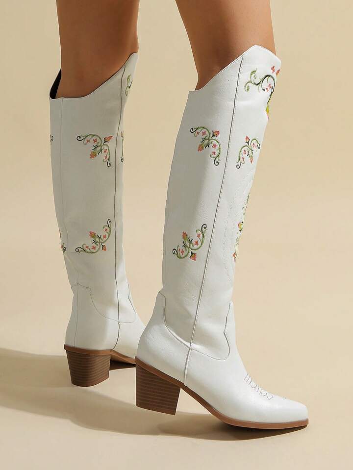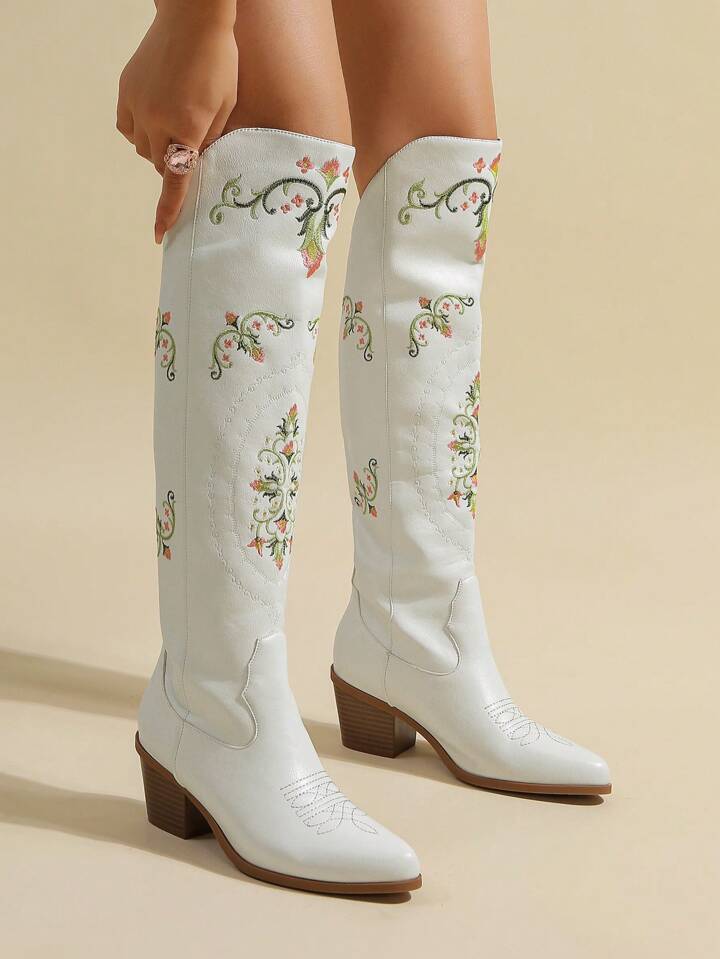 Fairycore Women Floral Embroidery Point Toe Knee-High Boots, Fashion Outdoor Boots