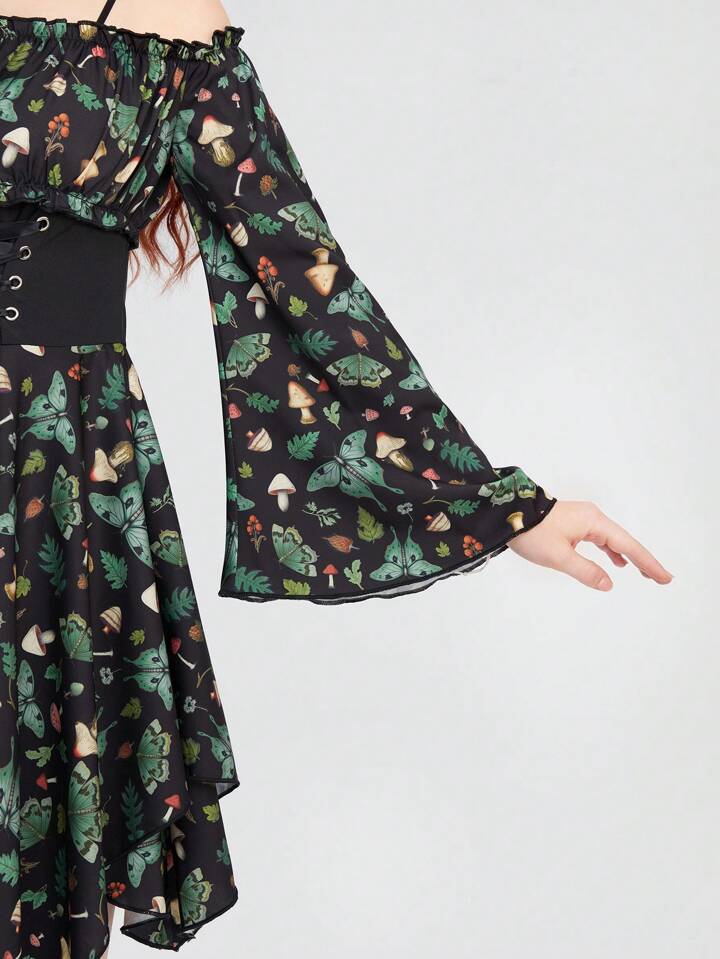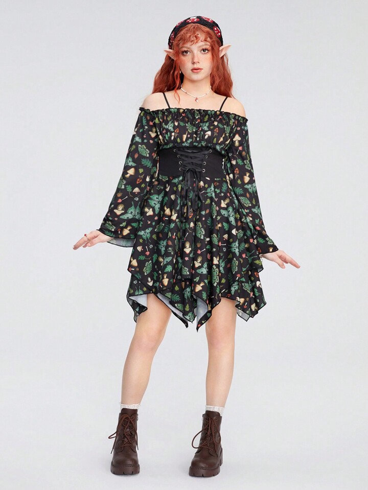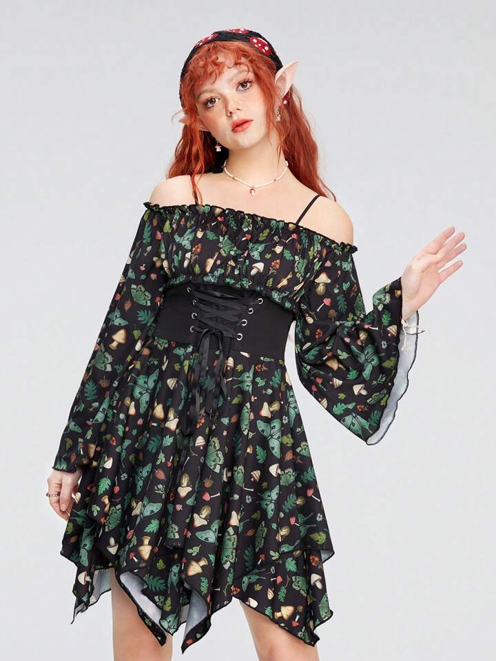 Fairycore Women's Allover Printed Patchwork Empire Waist Cold Shoulder Spaghetti Strap Flare Sleeve Dress
