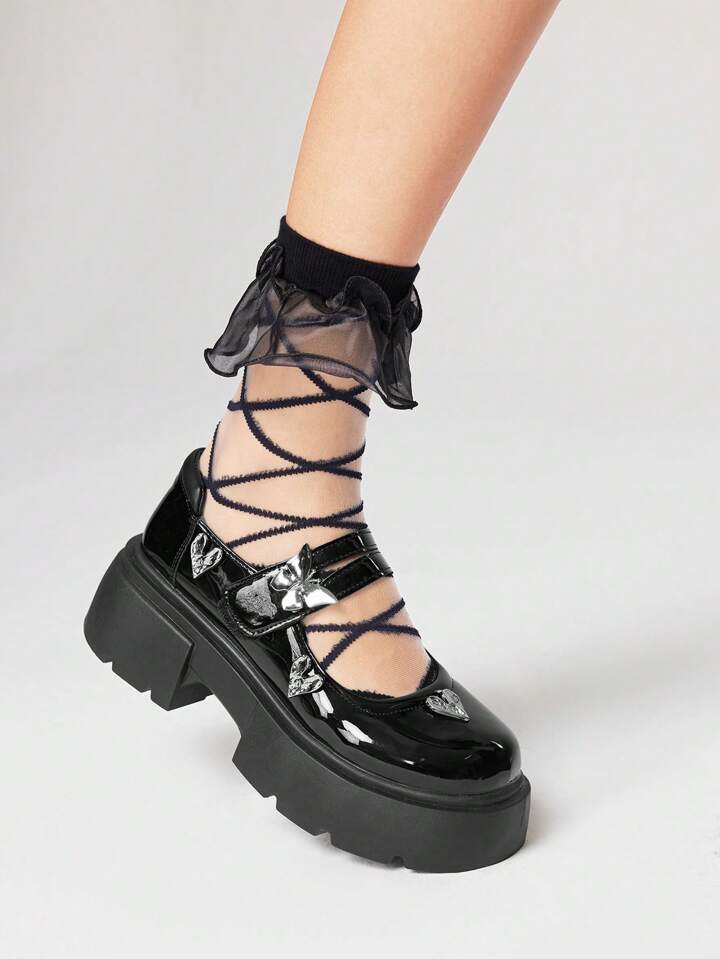 Fairycore Women's Black Slip-On Mary Jane Flat Shoes, Slip-On Buckle & 3D Butterfly Design, JK Japanese School Uniform Style, Platform & Wedge Heel