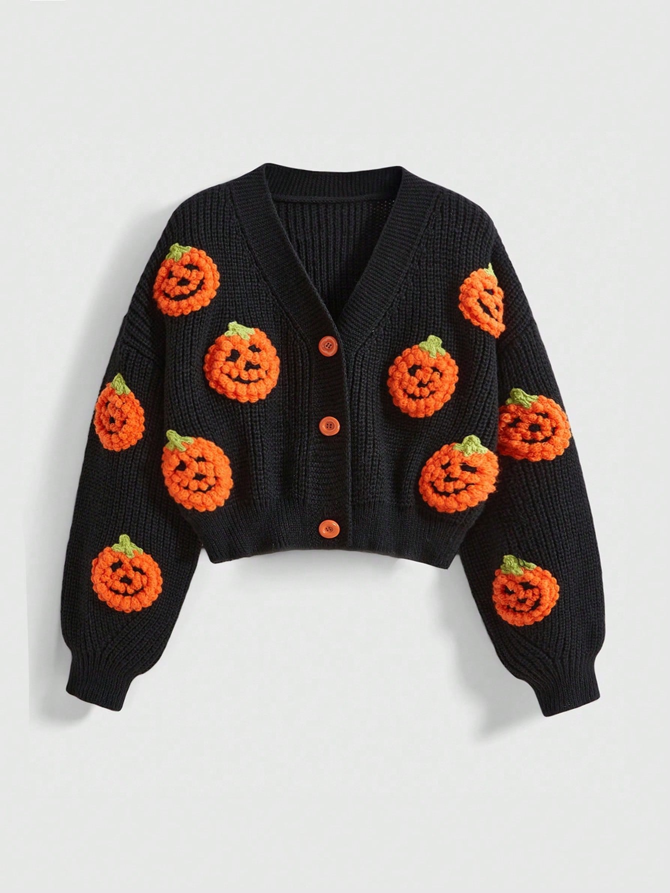 Fairycore Women's Casual V-Neck Halloween Crochet Pumpkin Knit Cardigan Sweater