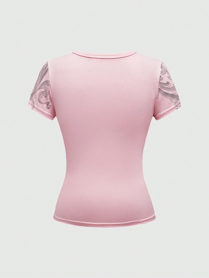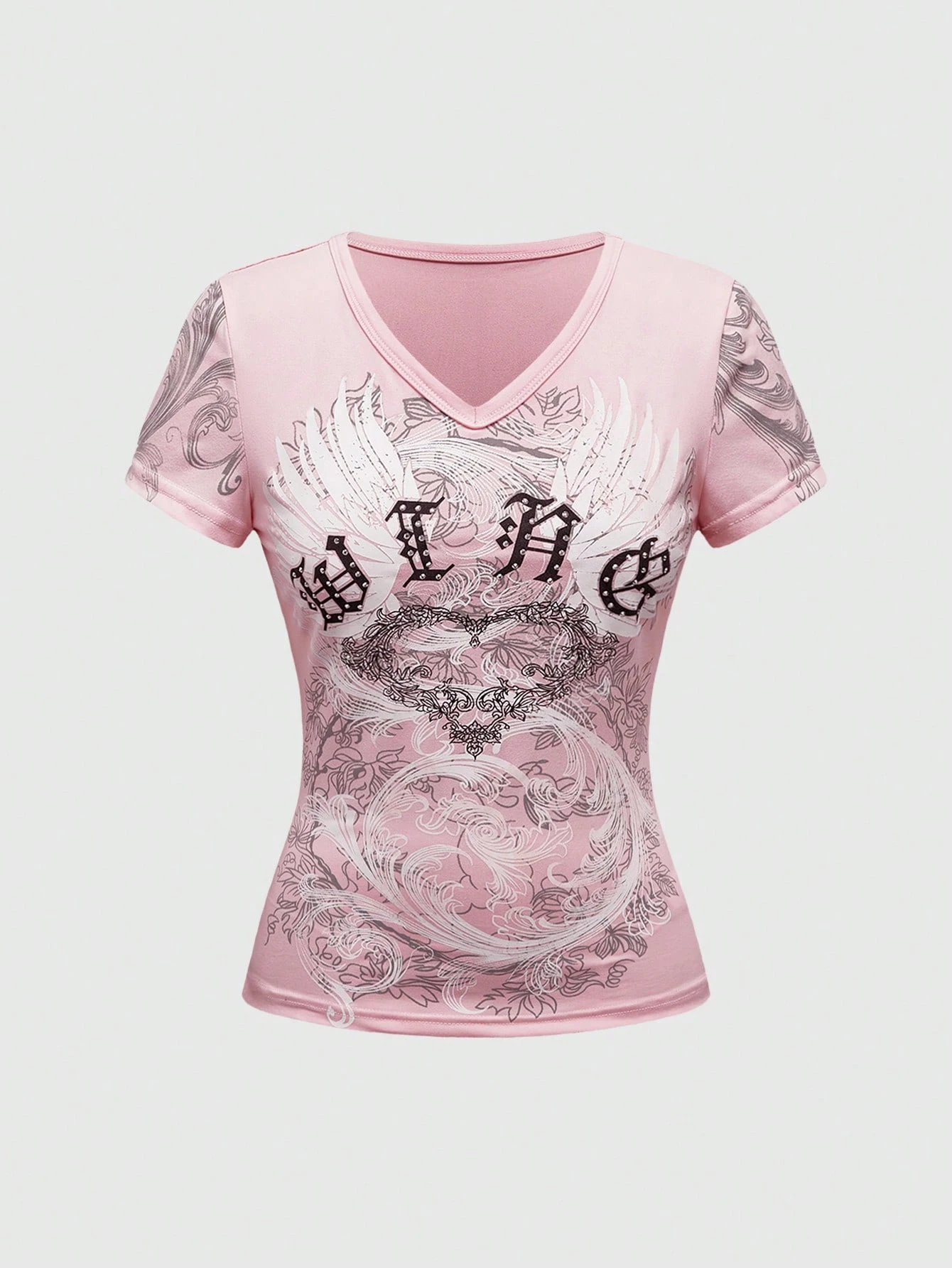 Fairycore Women's Casual V-Neck Long Sleeve Letter & Wing Print T-Shirt, Spring/Summer