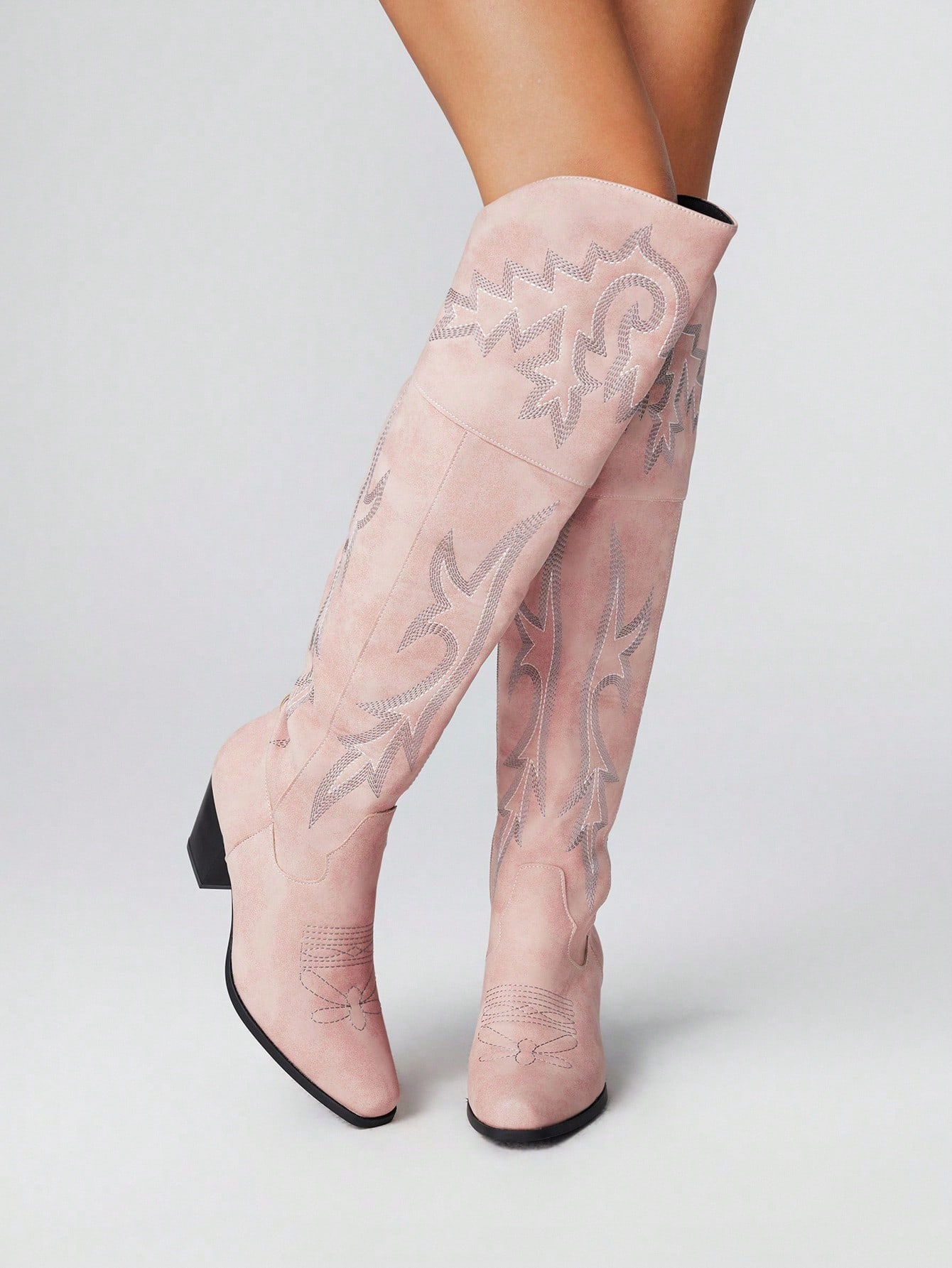 Fairycore Women's Cowboy Boots, Spring/Autumn New Kawaii Pink Embroidery Details Western Boots, Outdoor Fashion Slip-On Over-The-Knee Boots