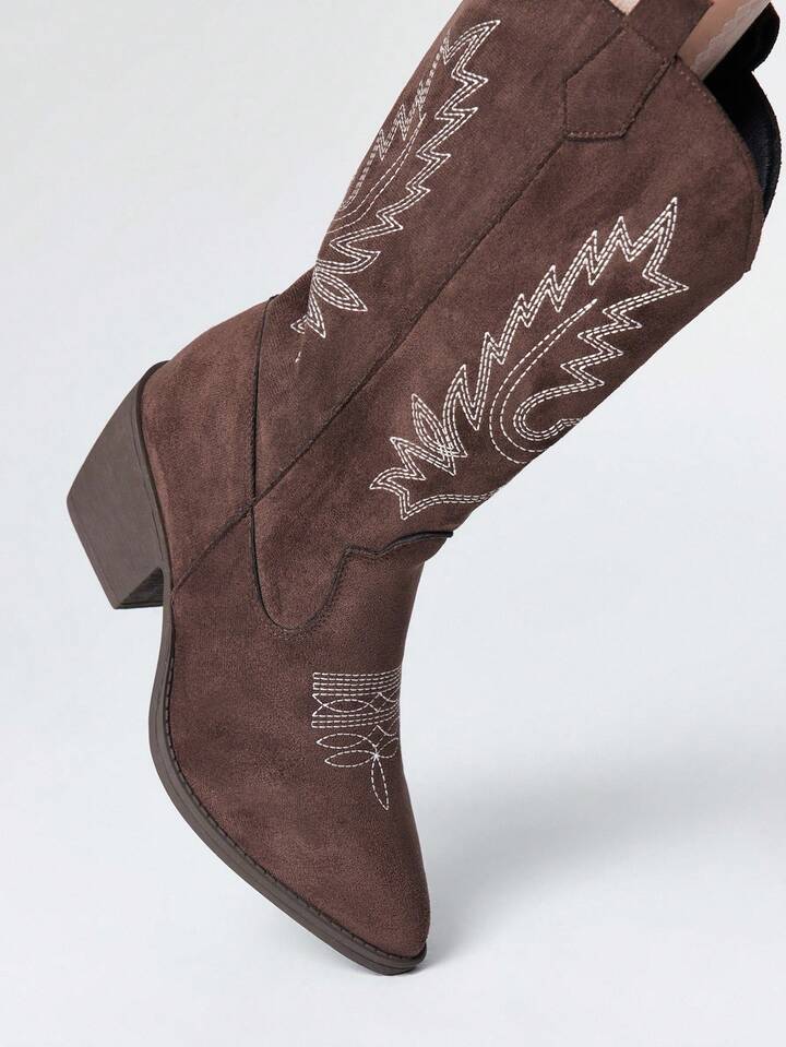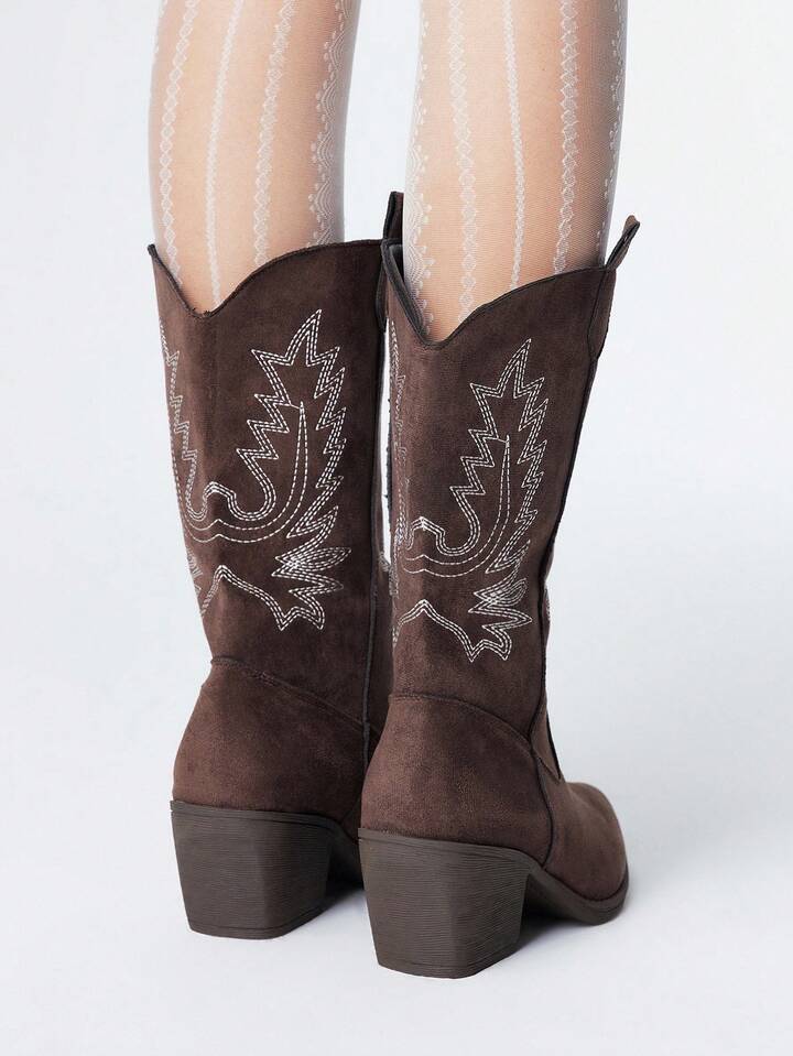 Fairycore Women's Dark Rock Punk Goth Boots, Brown V-Cut Embroidered Western Knee-High Boots, Thick Heel Tall Boots, Motorcycle Boots
