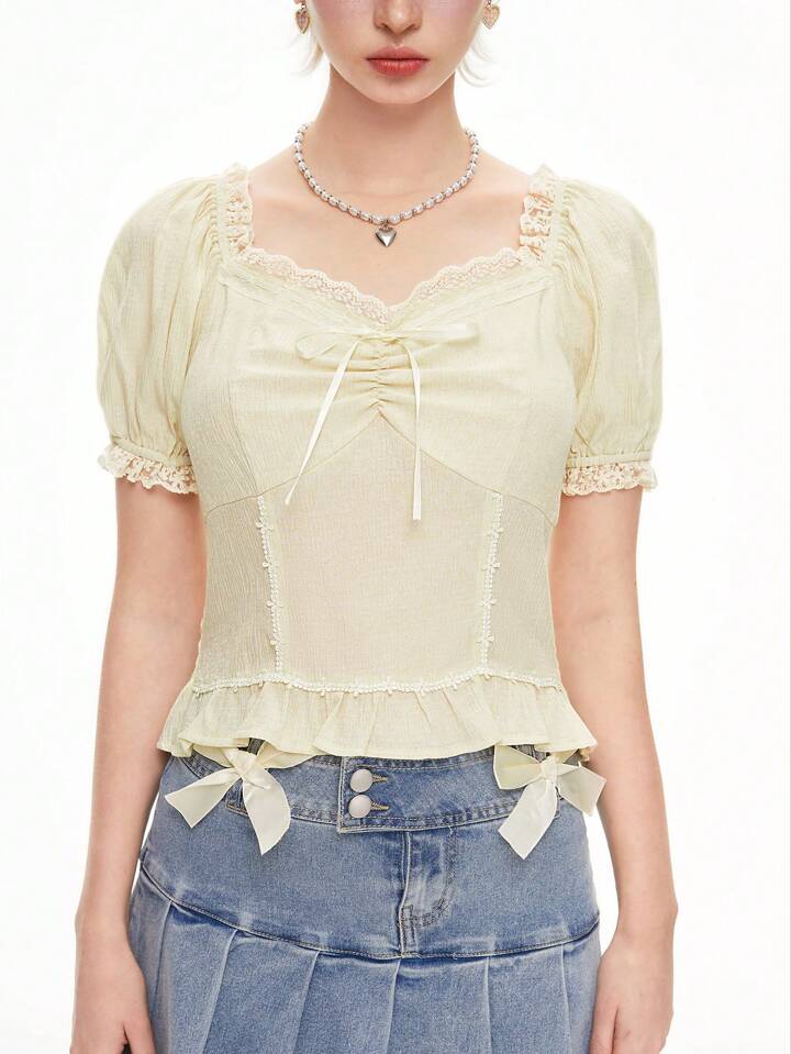 Fairycore Women's Lace Trim Puff Sleeve Retro Blouse