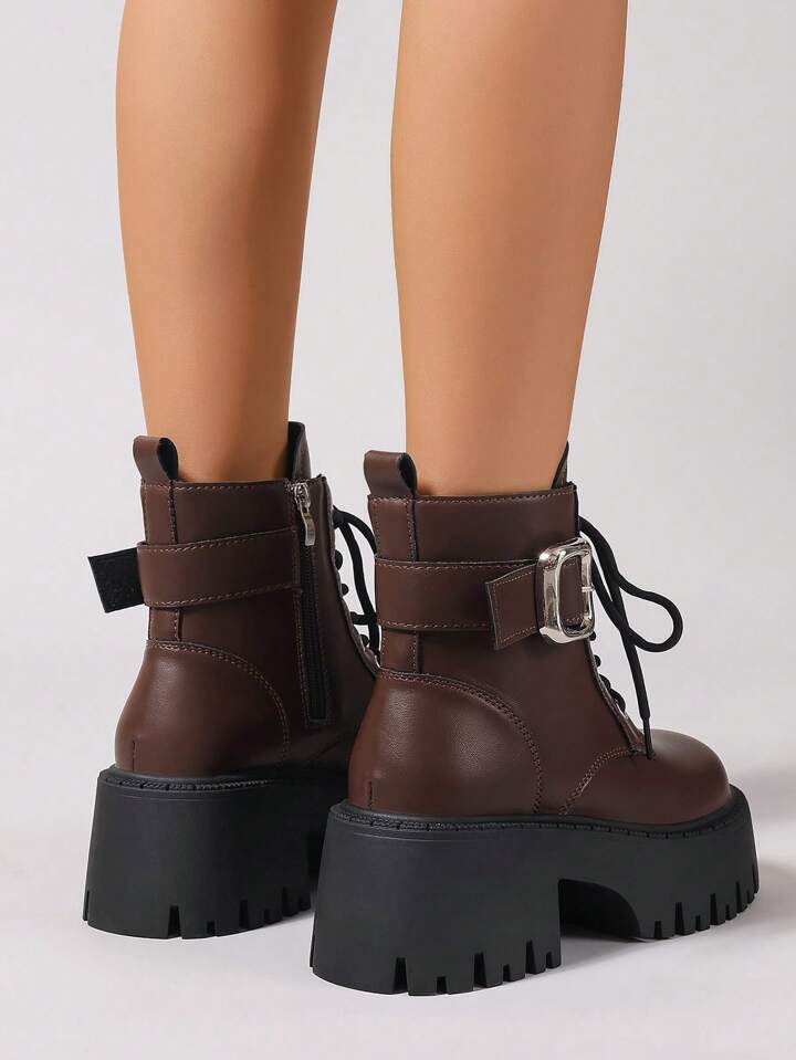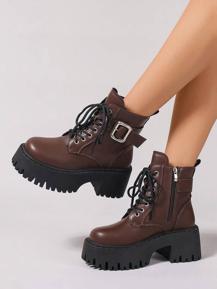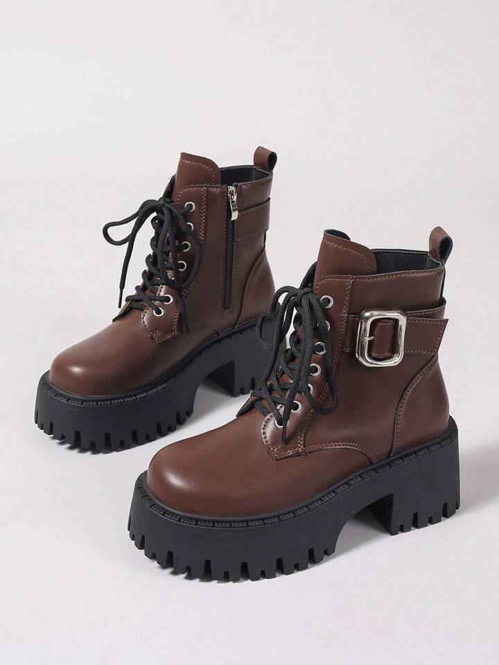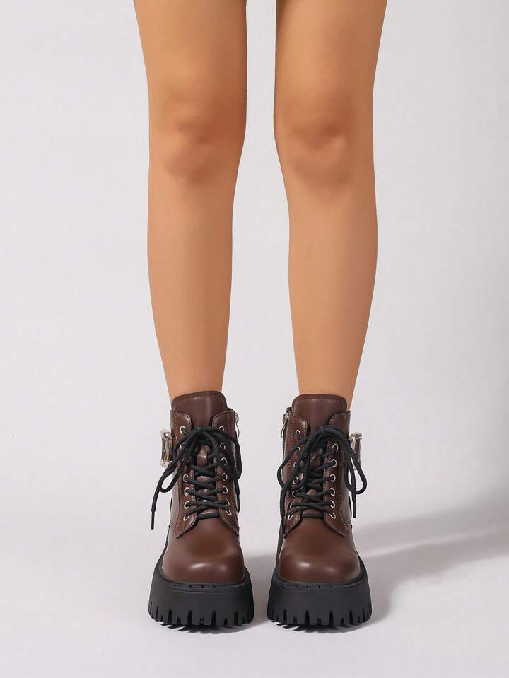Fairycore Women's Lace-Up Side Zipper Brown Short Shaft Chunky Heel Boots