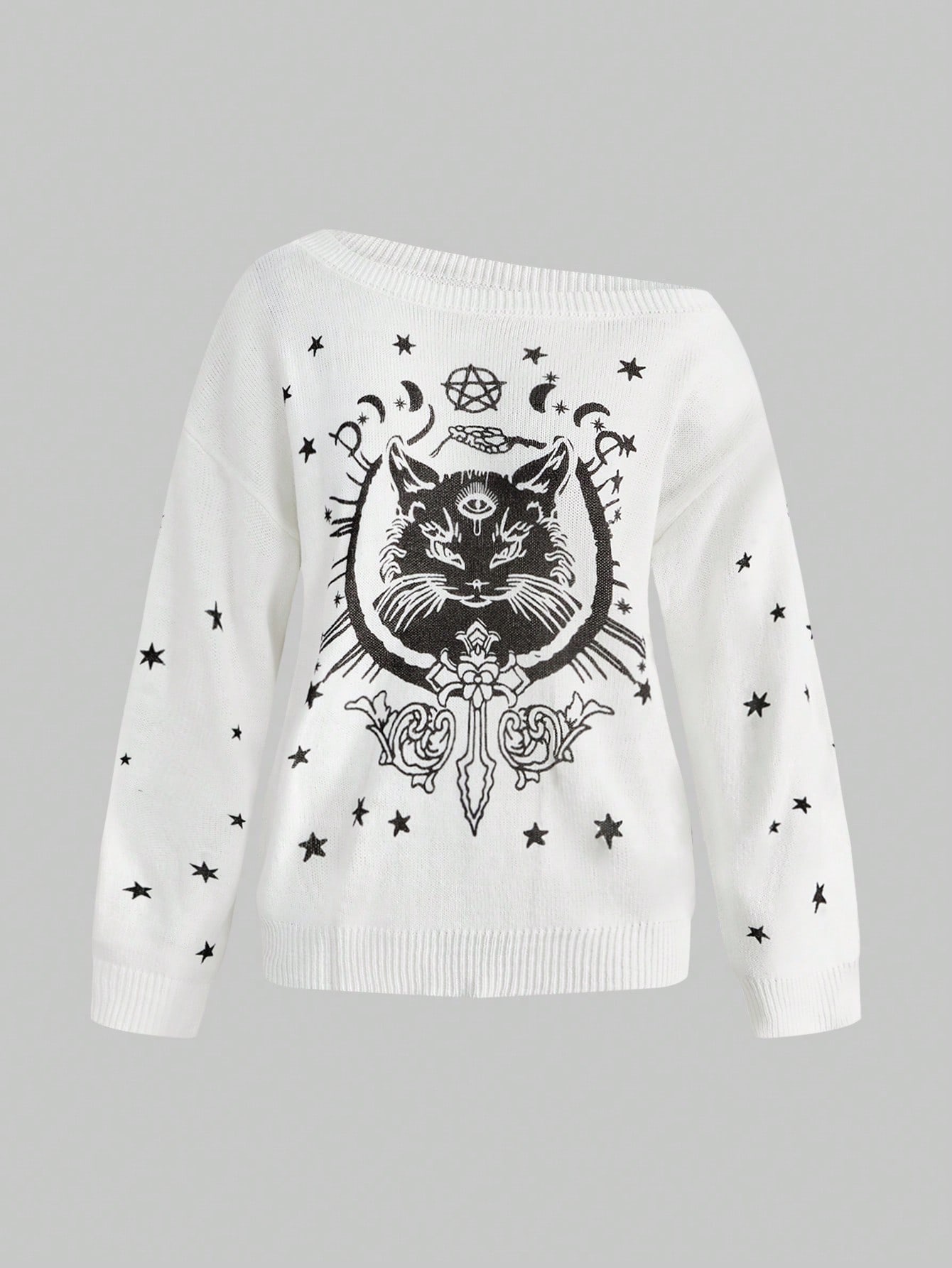 Fairycore Women's Loose Fit Oblique Shoulder Sweater With Dark Occult Cat & Star Print