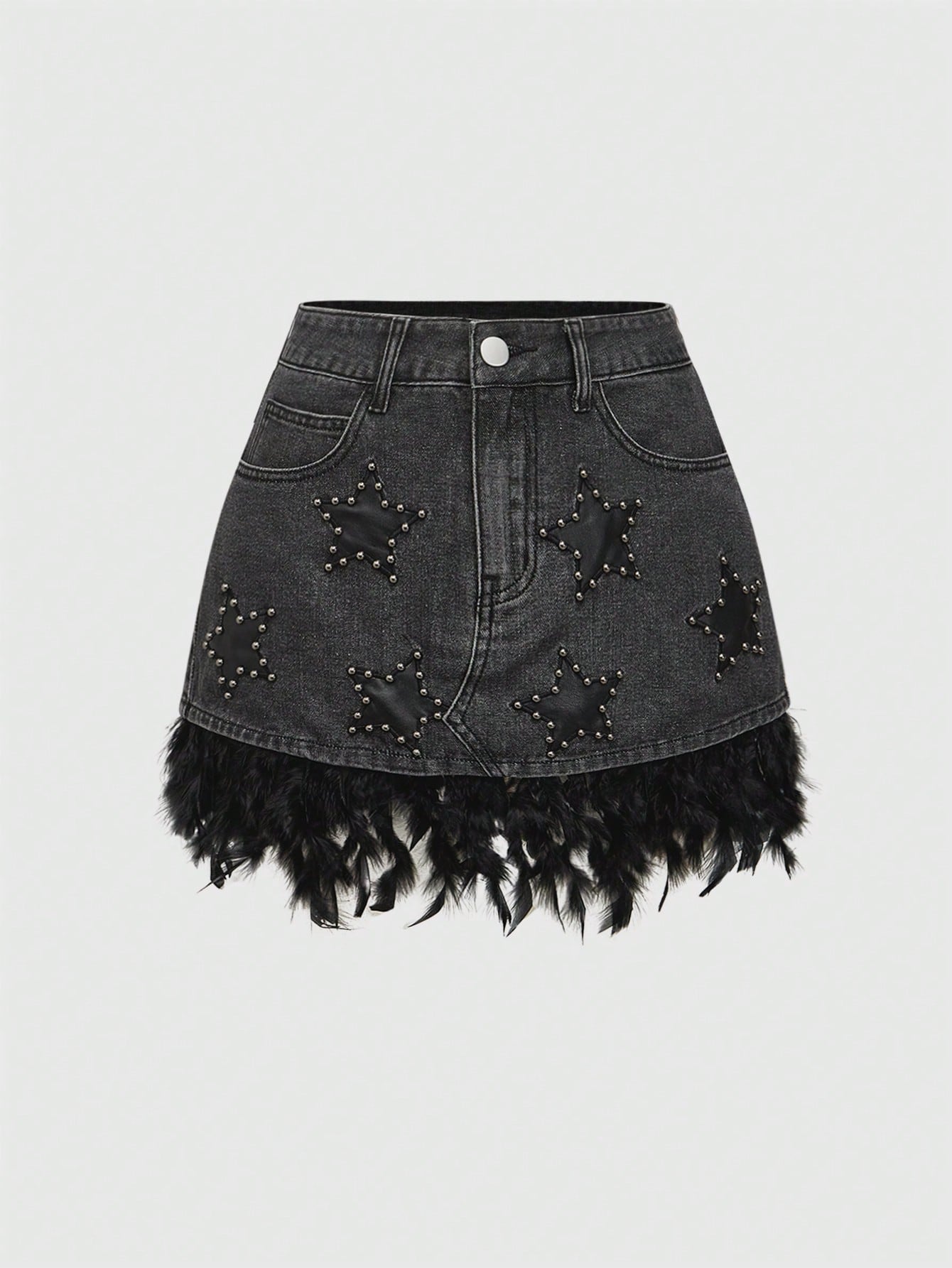 Fairycore Women's Low Waist Cropped PU Leather Studded & Feather Patched Denim Mini Skirt