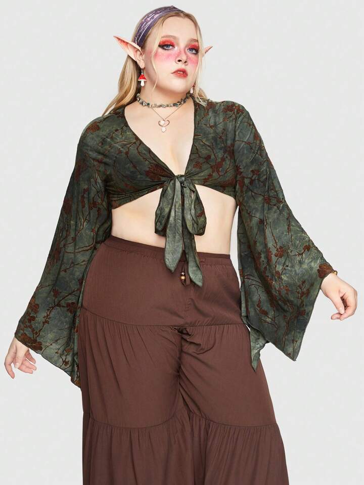 Fairycore Women's Plus Size Plant Print Bell Sleeve Tie Front Top