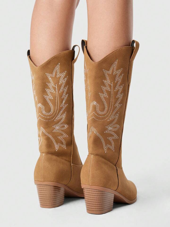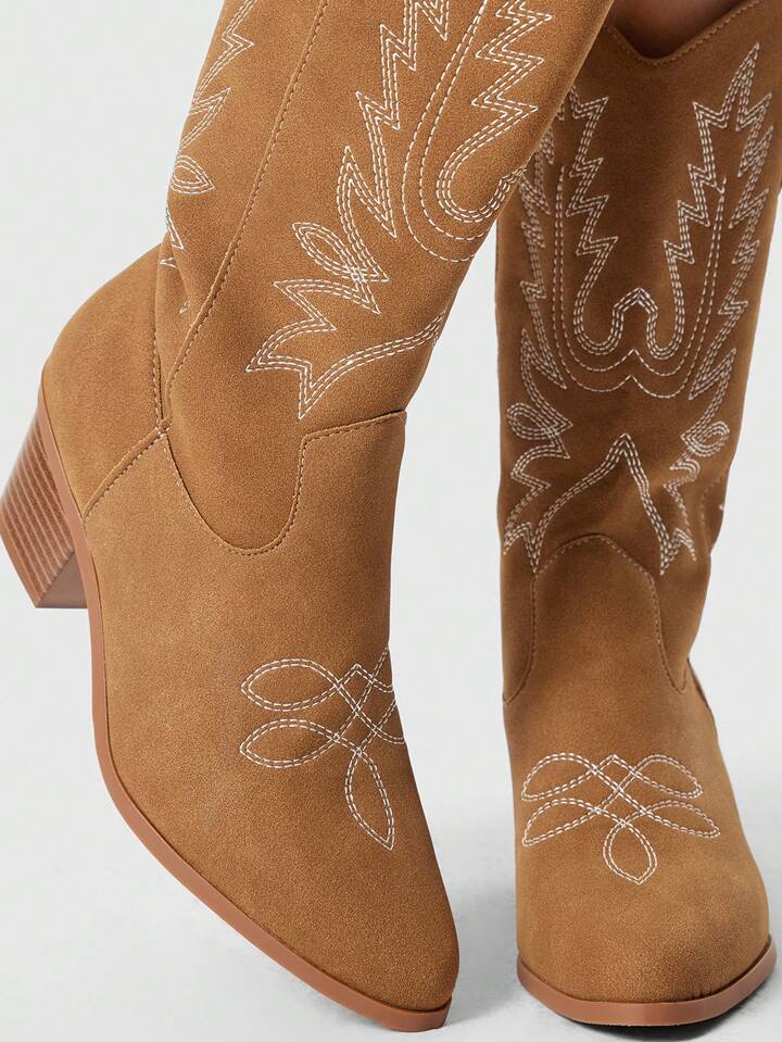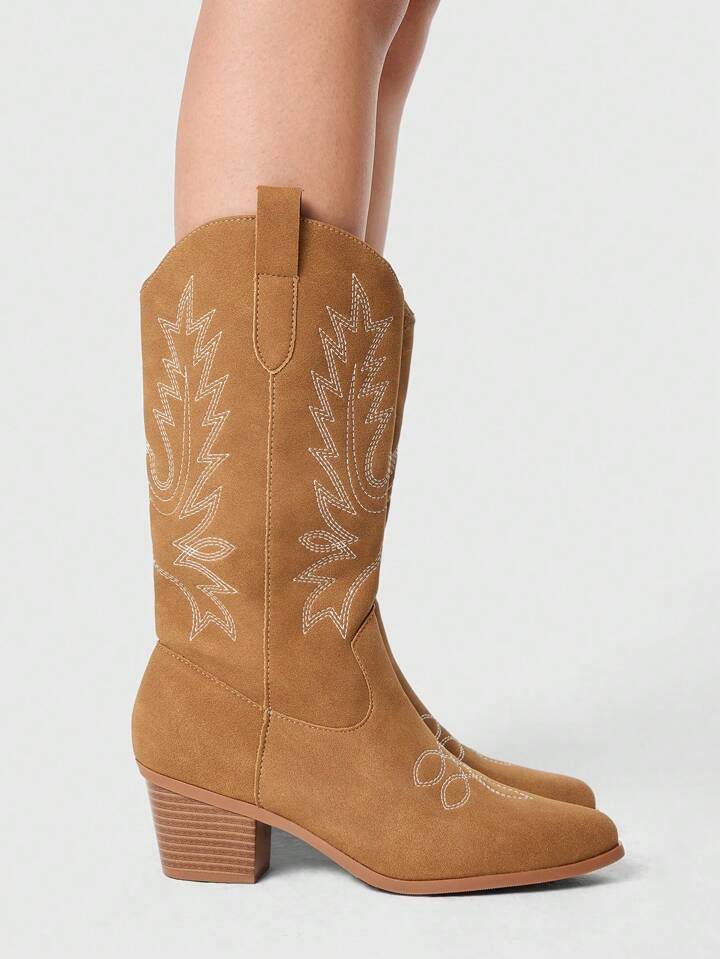 Fairycore Women's Plus Size Spring Autumn Cowgirl Boots, Mid-Calf Pointed Toe Embroidered Block Heel Pull On Riding Boots