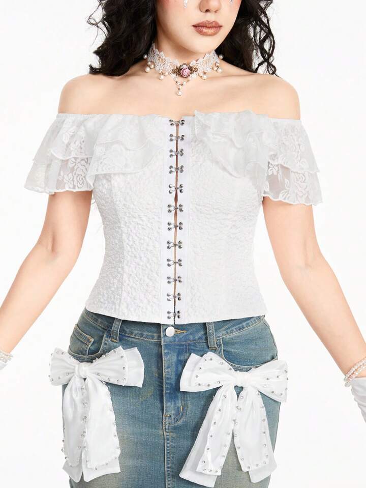 Fairycore Women's Tight-Fitting Off-Shoulder Top With Vintage Court Style Ruffle Lace And Texture Fabric