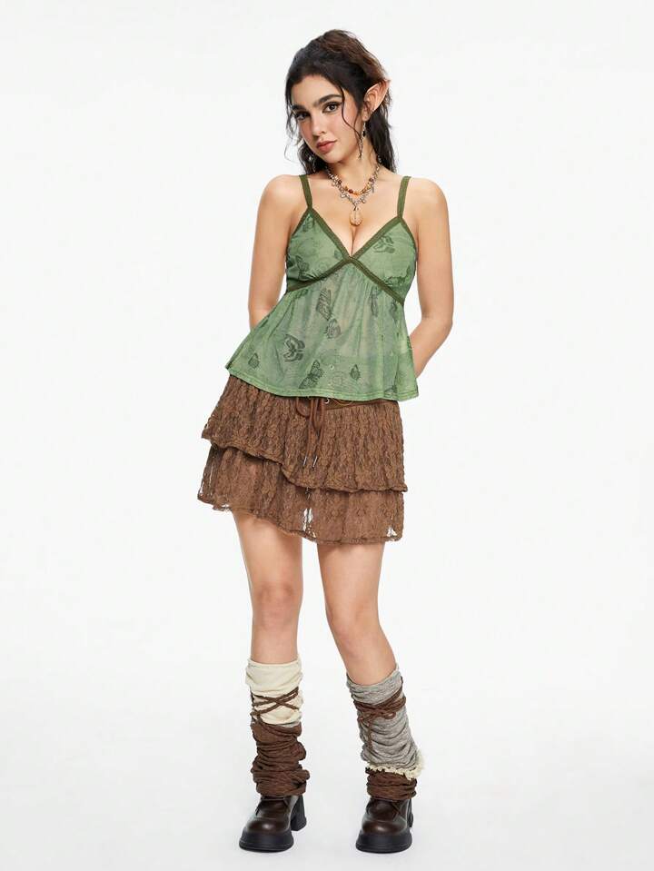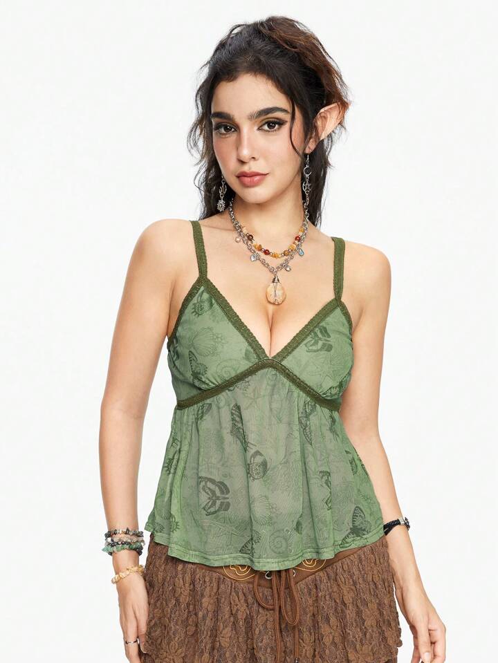 Fairycore Women's Vintage Butterfly, Starfish, Shell Print Mesh Camisole Top For Summer