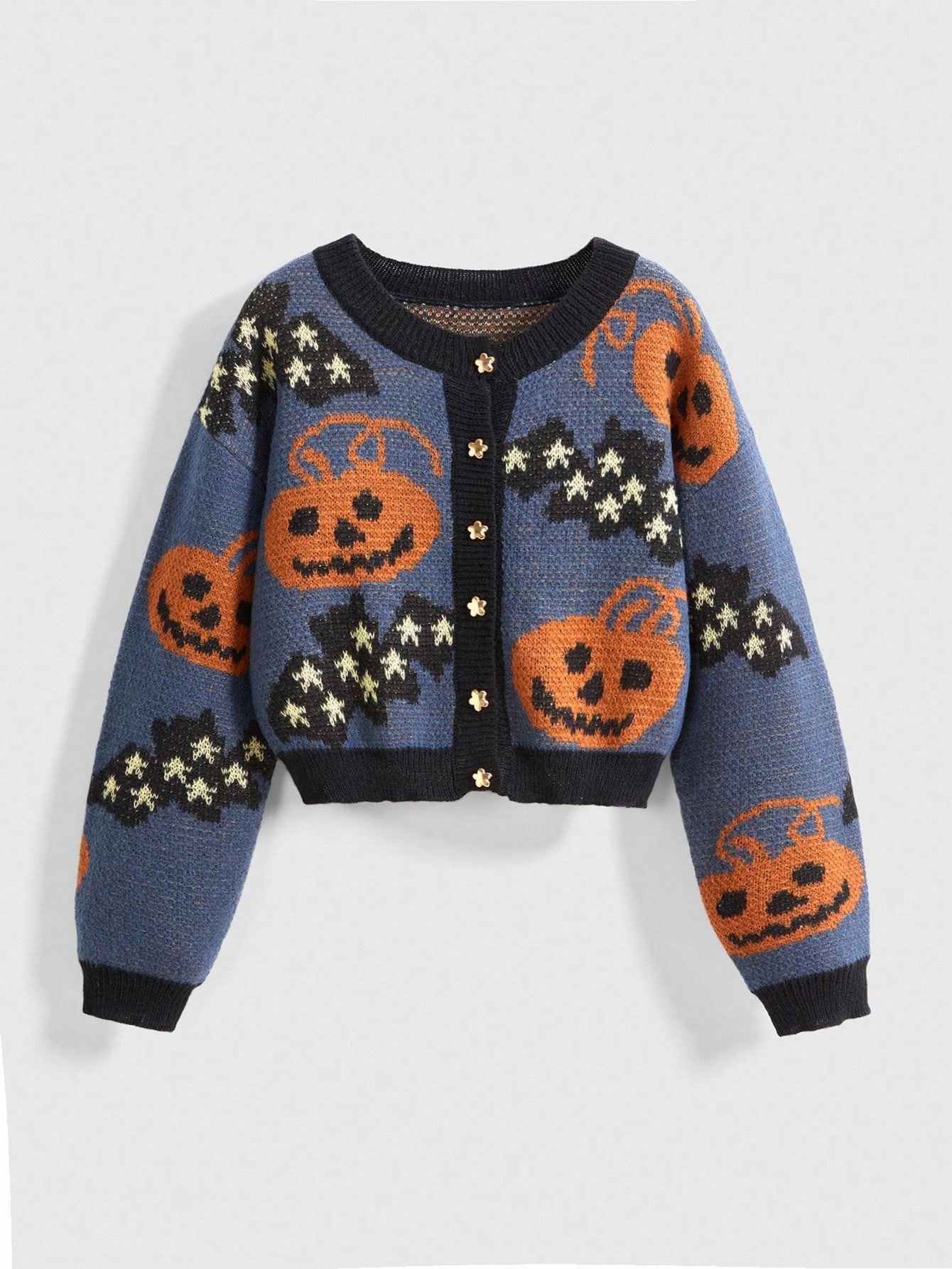 Fairycore Women's Vintage Pumpkin, Bat & Star Jacquard Knit Cardigan Sweater For Halloween