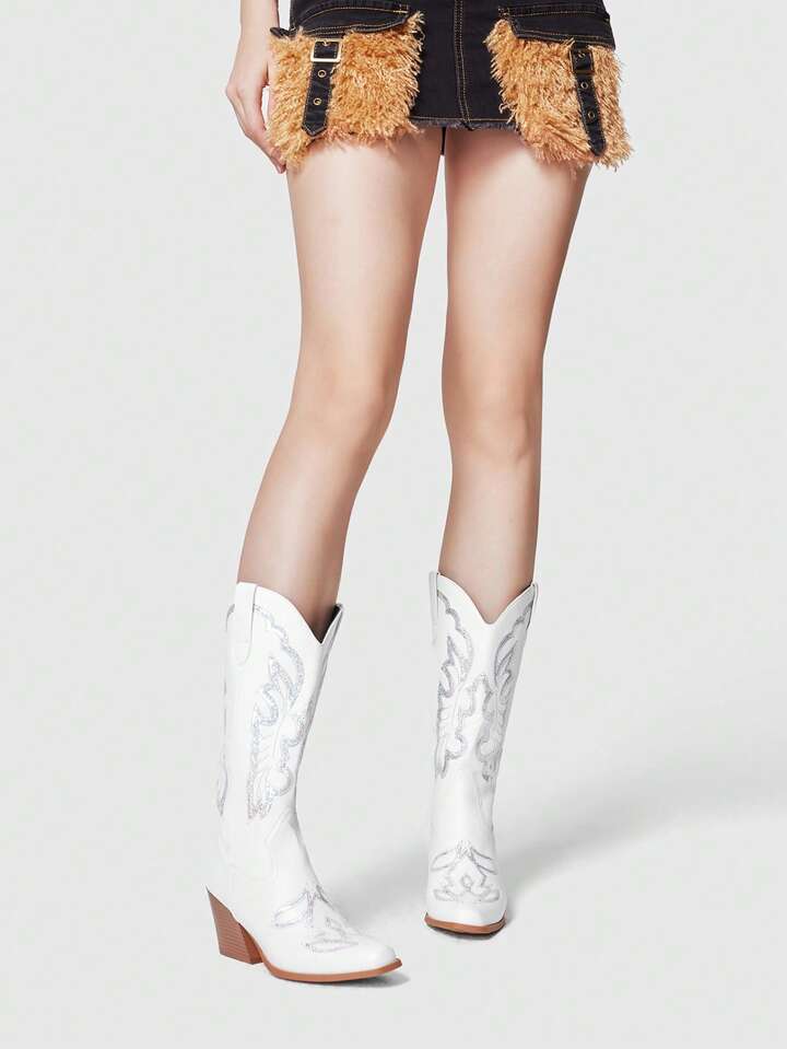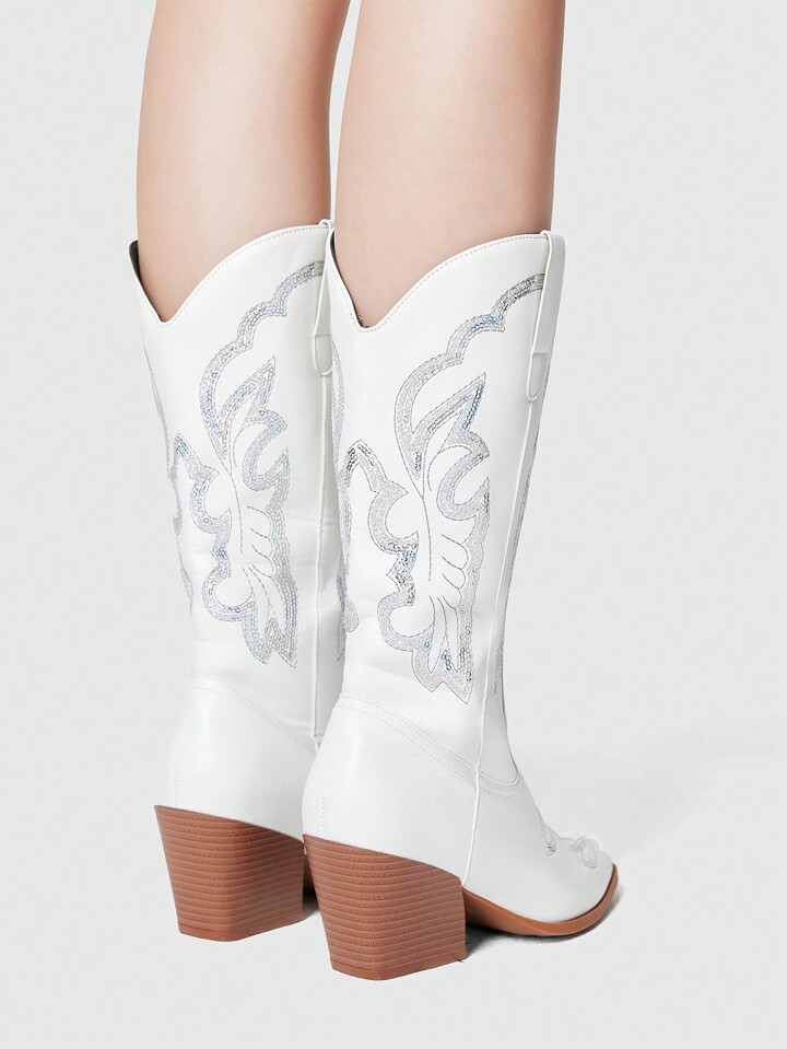 Fairycore Women's White Cowboy Boots, Elegant Classic Outdoor Casual Fashion Slip-On Sequin Embroidered Western Mid-Calf Boots, Spring/Autumn
