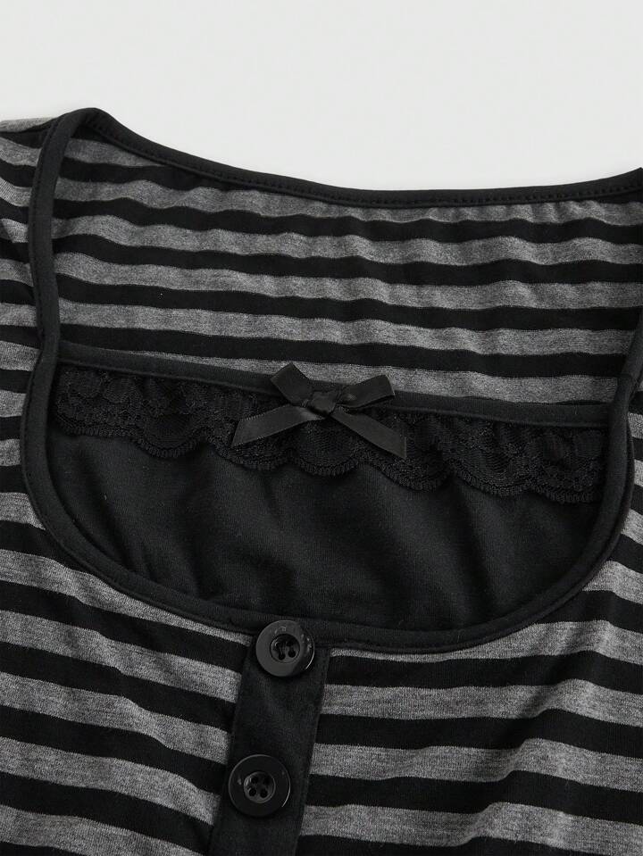 Fairycore Women's Y2K Vintage 2 In 1 Striped Contrast Lace Trim T-Shirt