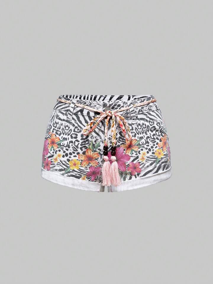 Fairycore Y2K Vacation Zebra Print Patchwork Floral Gal Style Denim Low-Waist Shorts