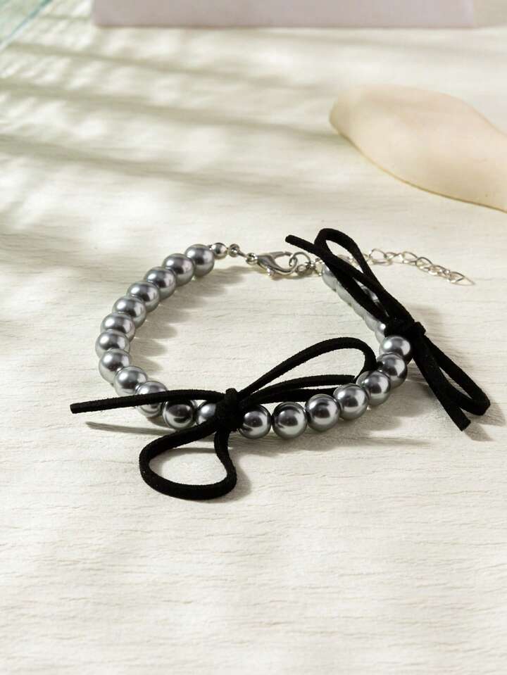 Fashionable Grey Pearl & Bow Decor Bracelet