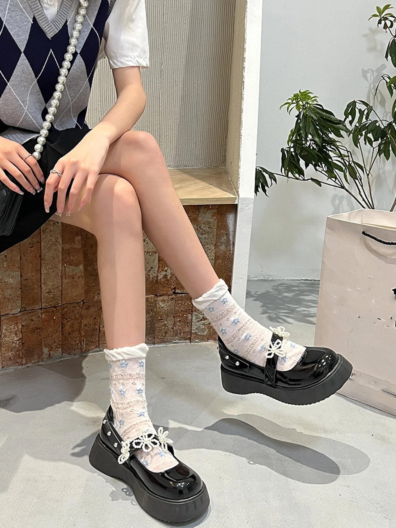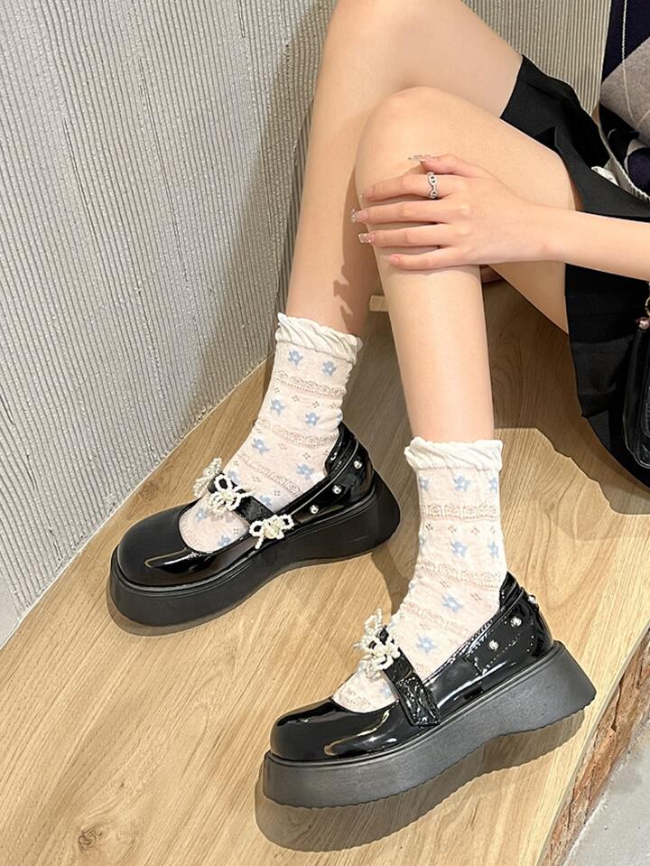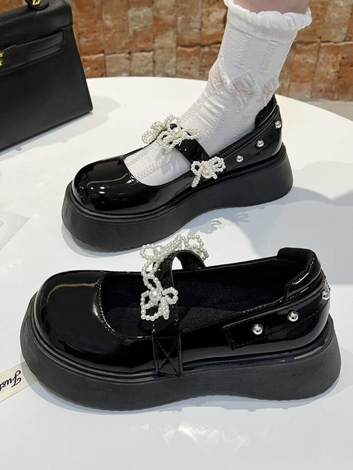 Faux Pearl Decor Flatform Mary Jane Shoes