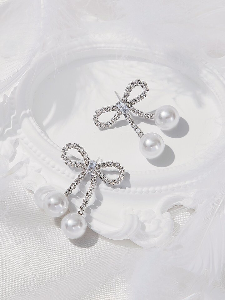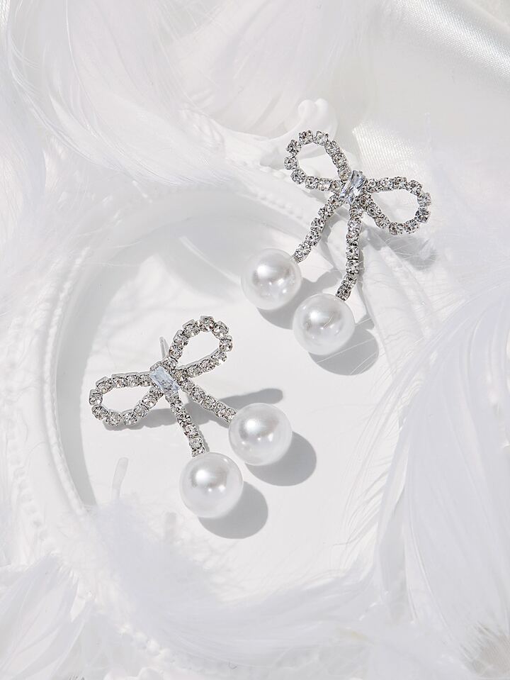 Faux Pearl & Rhinestone Bow Decor Stud Earrings Valentines