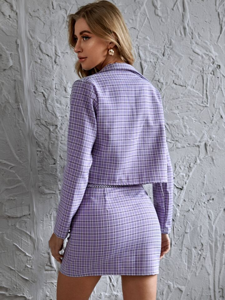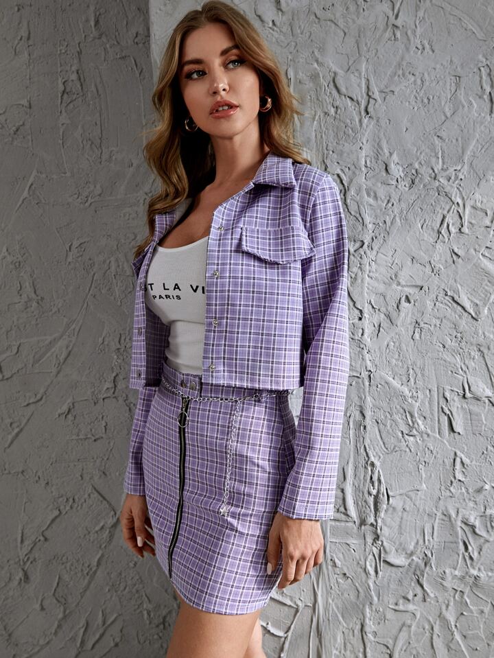 Flap Detail Plaid Jacket & Zipper Front Skirt Set