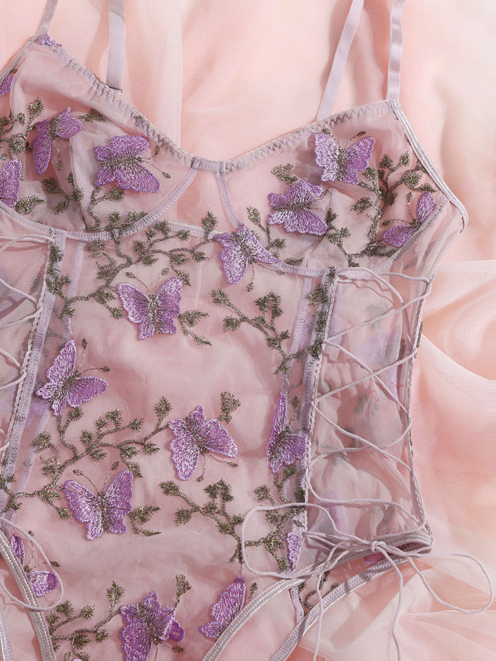 Floral Embroidered Mesh Lace-up Side Teddy Bodysuit