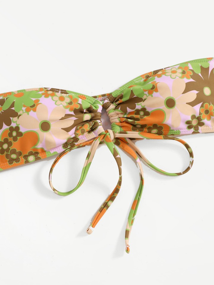 Floral Print Lace Up Bandeau Bikini